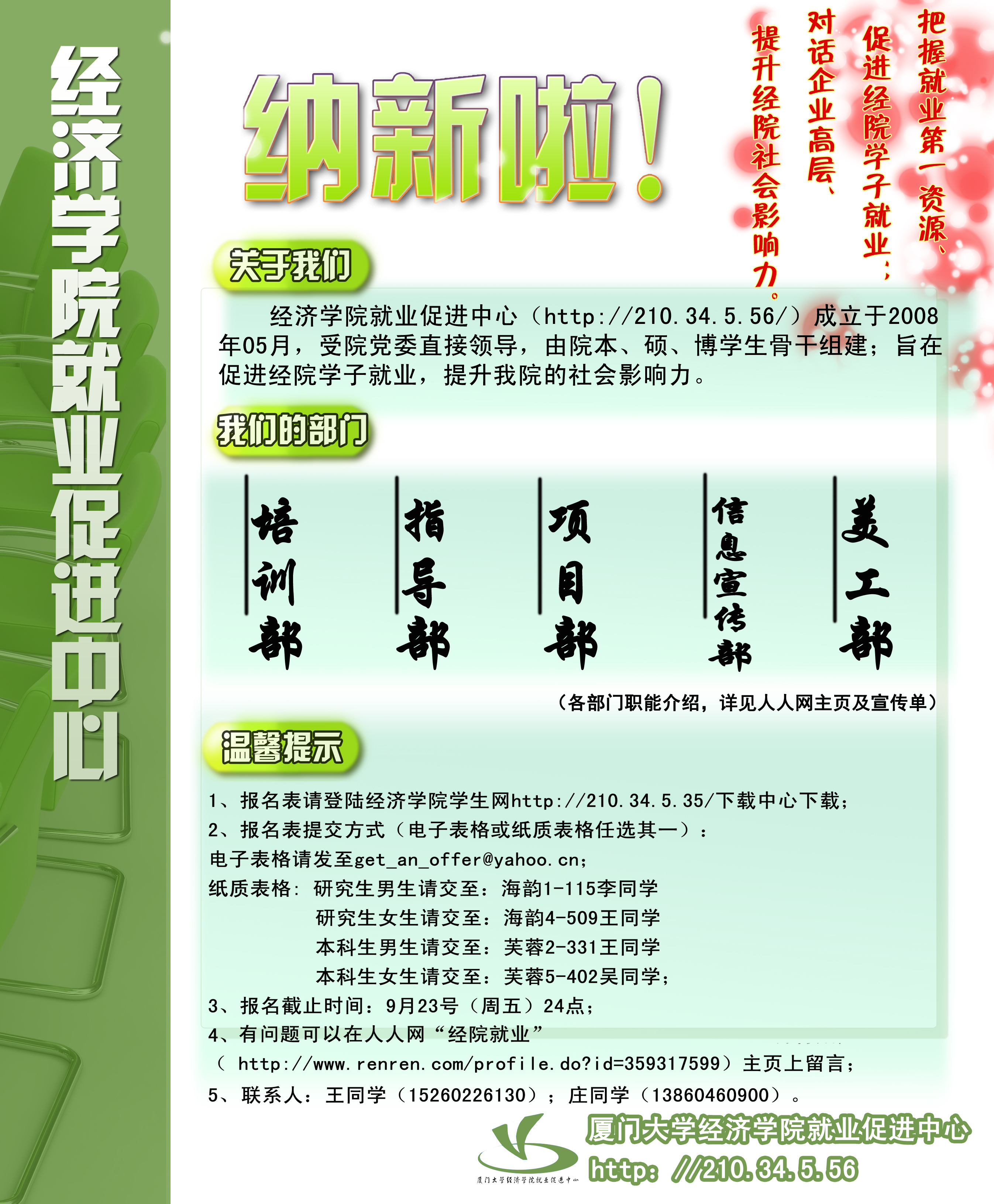 4、有任何疑问可以直接在人人网——“经院就业”(http://www.renren.com/profile.do?id=359317599)主页上留言询问;
