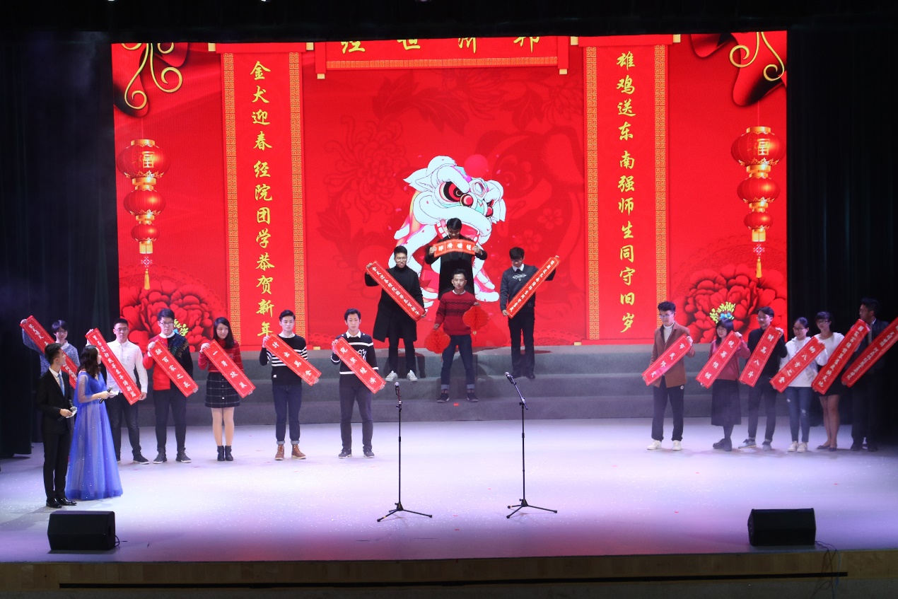 第二篇章旨在展示中华文化的博大精深,源远流长。舞蹈《荷风盛世》、民乐武术表演《兰亭序》、T台秀《中国·颜色》三个节目用民舞、传统服饰、民乐、武术等中华民族独有的传统文化元素,彰显了中华文化的丰富内涵。值得一提的是,在篇章间隙,两院本科生团总支、学生会为同学们送上了精致的原创对联,其中经济学院本科生团总支书记和学生会主席团成员送上的上联是“雄鸡送东 南强师生同守旧岁”,下联是“金犬迎春 经院团学恭贺新年”,横批“经世济邦”,将本环节推向高潮。