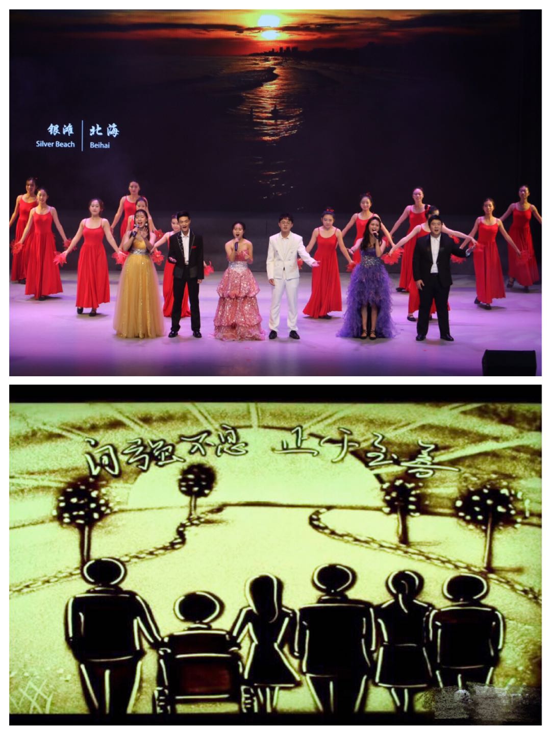 在晚会正式开始前的暖场环节中,经济学院、wise2017级本科生以班级为单位拉歌,同学们激情昂扬,唱响青春、歌颂祖国,展现了“班班有歌声”的良好风貌。晚会第一篇章旨在展现青春与梦想。啦啦操队用充满激情与活力的舞蹈拉开晚会序幕。接着,观众们在组曲《青春进行曲》的明快旋律中与沙画《生命曙光》的温柔笔触下,开启了一场梦的旅行。随后,院主持人队用一场深情、感人的原创诗剧《亚南故事》,还原了亚南校长的自求学、从戎到教学、科研的人生经历,歌颂亚南校长自强不息、心系天下的伟大抱负和矢志不渝、追求真理的科学精神,在亚南校长逝世50周年之际,表达了两院师生对老校长的深切怀念。
