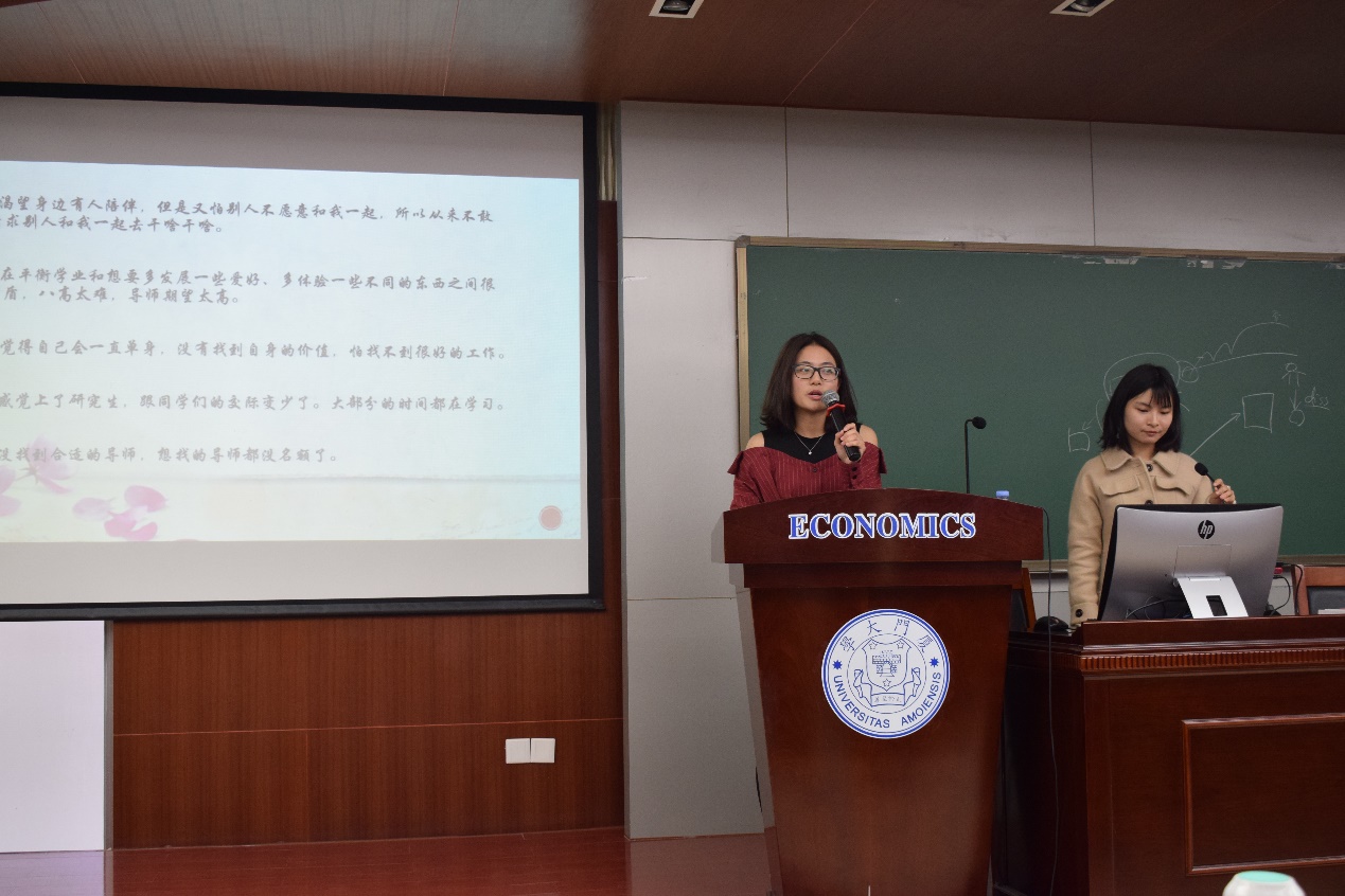 12月27日上午,由共青团厦门大学经济学院委员会主办、经济学院研究生会生活部承办的以“如何管控研究生压力”为主题的心理讲座在经济楼N302成功举办。厦门大学心理咨询与教育中心的江珊老师受邀出席本次活动,担任主讲人。本次讲座面向经济学院全体研究生,同学们热情高涨,逾100人参加本次讲座,其中不乏博士研究生。