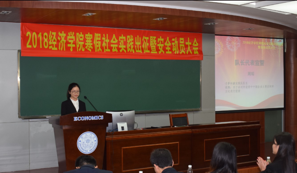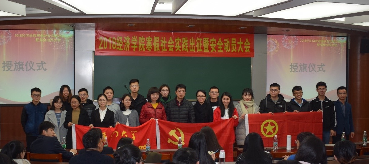 2018年1月8日下午,由共青团厦门大学经济学院委员会主办、经济学院研究生会实践部承办的经济学院2018年寒假社会实践出征仪式暨安全动员大会于经济楼N302教室圆满举行。大会对2018年寒假社会实践做出部署,并就实践中的安全问题做了专题动员。院党委副书记邱旺土老师,院团委副书记陈启妍老师,辅导员林轶凡老师、刘长青老师出席了本次大会。