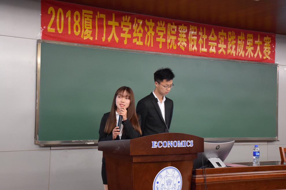 伴随着经济学院寒假社会实践活动落下帷幕,3月23日晚,社会实践成果展示大赛在经济学院N302如期举行。本次活动由共青团厦门大学经济学院委员会主办,经济学院研究生会实践部承办。参加本次成果大赛展示的有辅导员刘长青老师、4位博士研究生、研究生会委员,以及15支社会实践队伍的成员。各实践队伍依托自身专业知识,围绕社会热点问题,依次展示寒假期间实地调研和研究分析的成果。