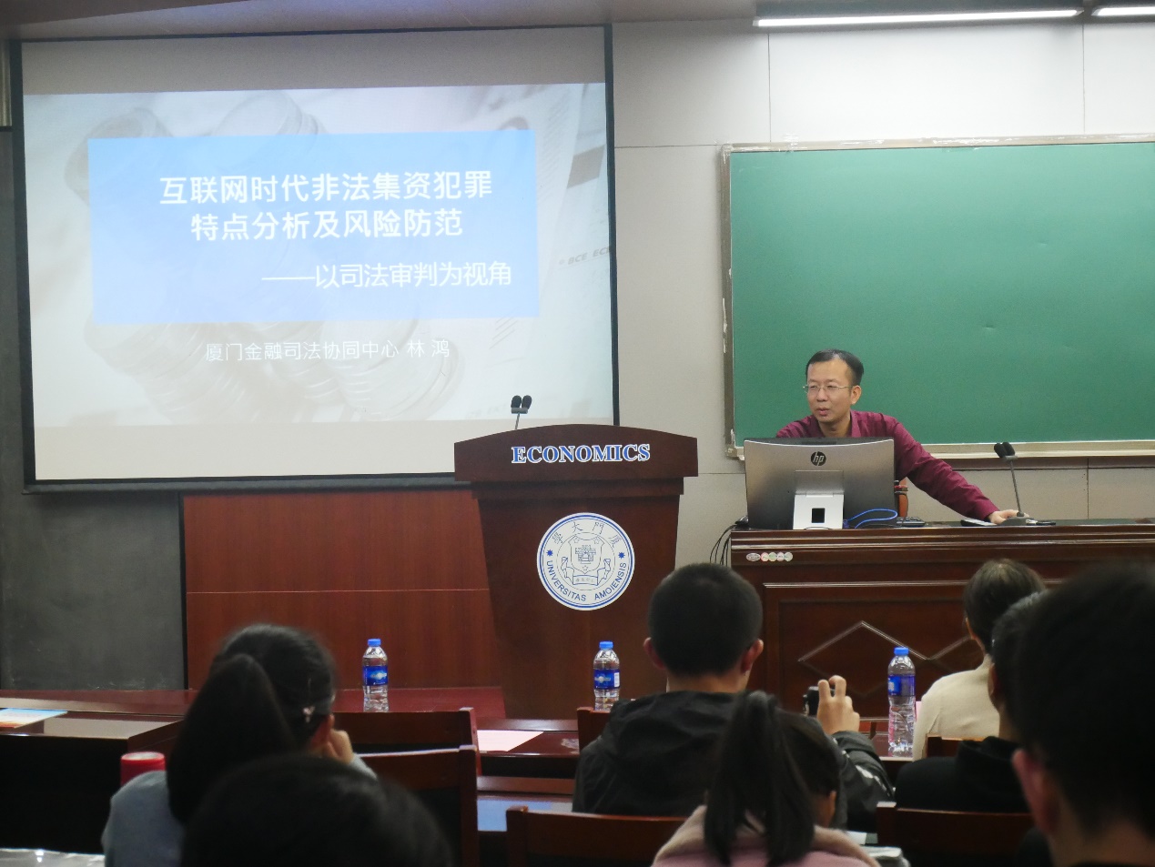 思明区人民法院金融法庭副庭长林鸿带来主题为“互联网时代非法吸收公众存款犯罪特点分析及风险防范”讲座。林鸿副庭长以司法审判为视角,分析了诸多案例,让大家切实了解当前罪犯的各种骗术,从而提高风险防范能力。