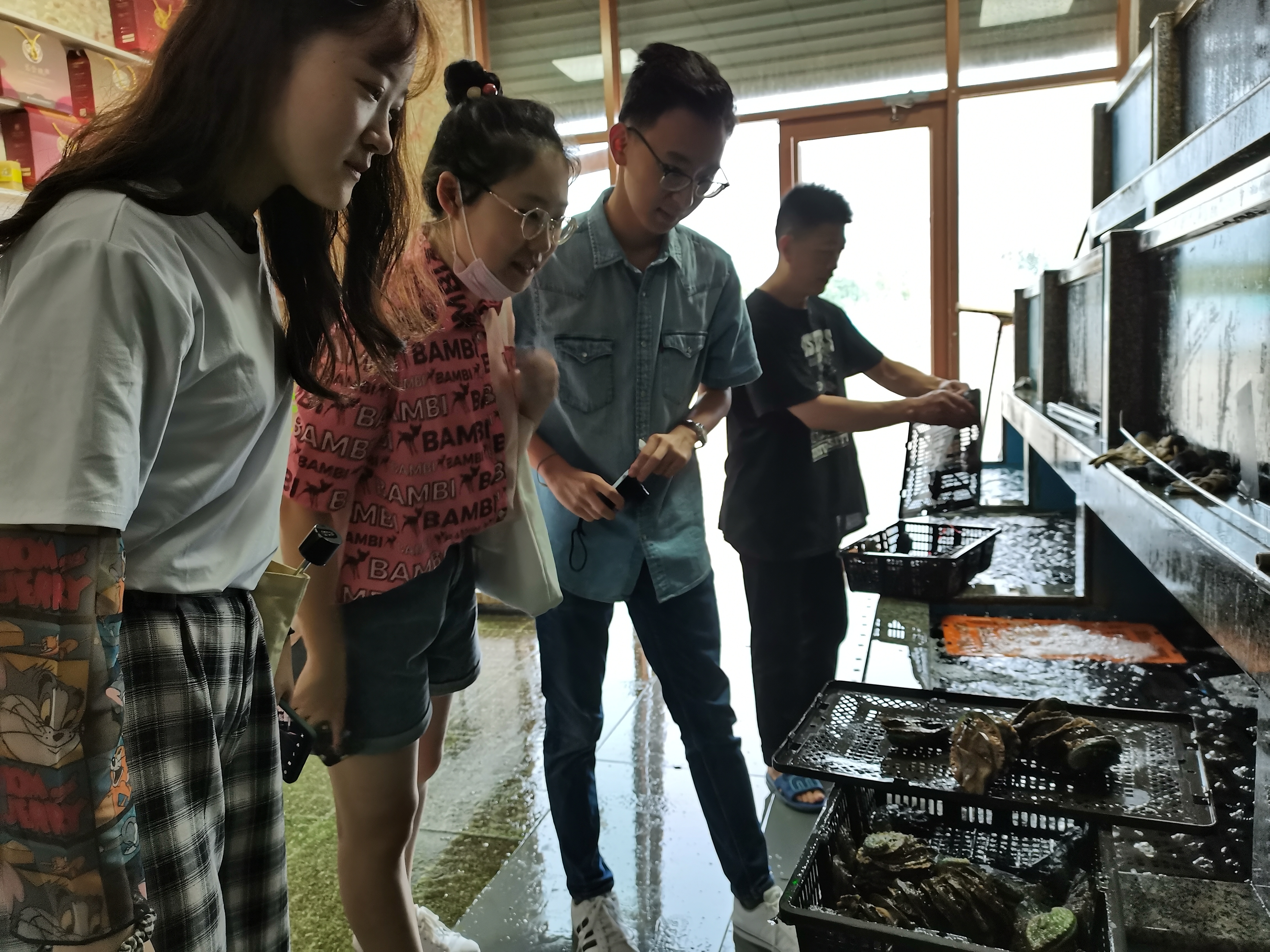实践队成员们出发来到调研地——荣成市西海海鲜市场,这里主要聚集着鲍鱼养殖户和粗加工海产品的销售商。虽受疫情影响市场内有少数店铺关了门,但是大多数的活鲜店敞开了大门,不时有大货车进进出出。特色海产品中鲍鱼、海参等最为出名,于是一起走访市场内多家以鲍鱼、海参为主要卖品的海鲜店。对于鲍鱼养殖户而言,经了解队员发现,其产业内已经形成了成熟的经营模式,各个商家基本都有了稳定的鲍鱼苗的供应商和鲍鱼的收购商,并且销售更多的是针对大宗交易,以此将鲍鱼分散到全国的餐饮业市场和海鲜零售市场,整体的经营情况相当稳定,因此他们对电商这种销售渠道并未有很大热情。