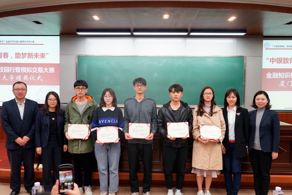 2月27日晚,厦门大学“中银致青春,助梦新未来”金融知识校园行暨模拟交易大赛颁奖仪式圆满落幕。大赛由中国银行厦门市分行、共青团厦门大学委员会、厦门大学经济学院主办,中国银行三家村支行、中银国际证券厦门营业部、厦门大学经济学院团委承办。中行厦门市分行个人金融部总经理陈仪、中行厦门市分行个人金融部总经理助理韩淑颖、中行厦门市分行三家村支行行长谢哲伟、中行厦门市分行思明支行业务发展部主任蔡晨蓉、中银国际证券厦门营业部总经理陈舒婕、校团委副书记廖晓波、经济学院党委副书记周蕾、辅导员刘长青等出席了颁奖仪式。