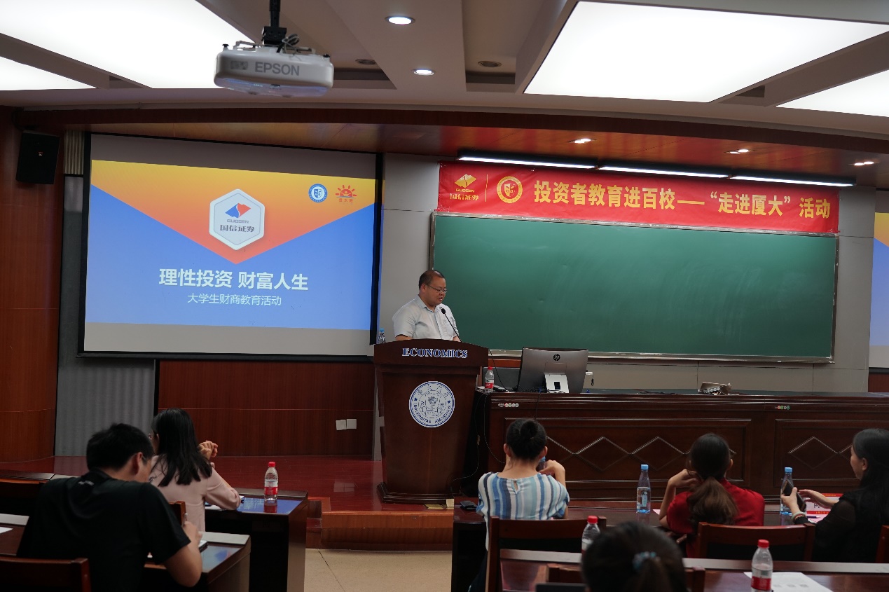 6月23日下午,“投资者教育进百校”厦门大学专题讲座在经济学院顺利举行。厦门证监局信息调研处副处长朱玲、经济学院党委副书记周蕾、厦门证券期货基金协会综合部主任陈静、国信证券股份有限公司福建分公司总经理陈茹娟等出席了本次活动。活动由厦门市证监局支持指导,厦门证券期货基金业协会、共青团厦门大学经济学院委员会主办,国信证券福建地区投资者教育基地承办。