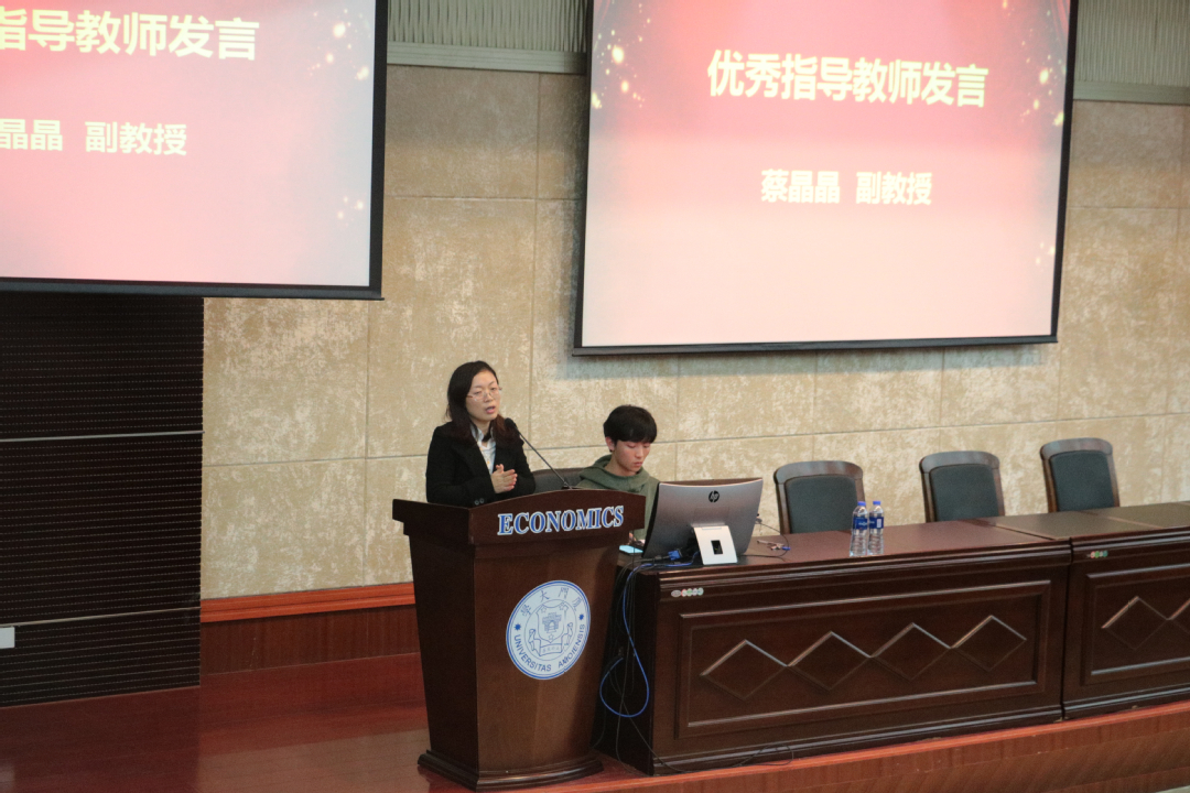 优秀指导老师代表蔡晶晶副教授分享了指导经验,她肯定了同学们对实践活动的积极参与和富有创新,并从选题的可行性、前瞻性和连续性、跨学科创新思维的养成、文献阅读积累量及动态变化思维等四个维度提出指导建议。