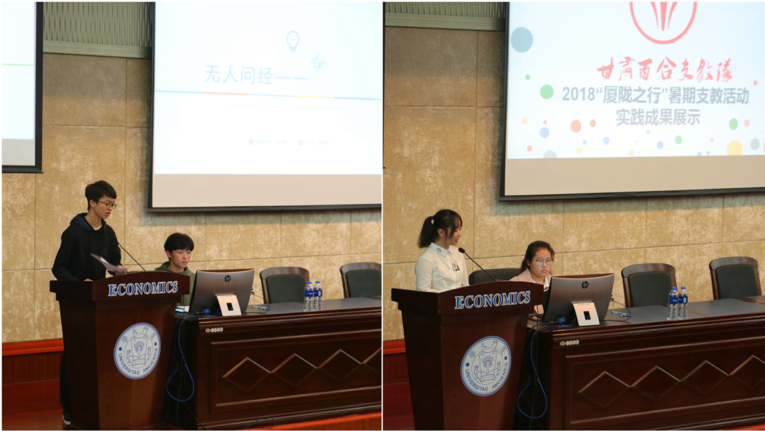 2018年暑期社会实践,厦大经济学科共组织92支实践队、近一千名同学、72位指导老师参与暑期实践工作,涌现出理论社团实践队、博士团、支教队、台港澳学生实践队、金融学国际化试点班体验式教学等各具特色的项目。经济学院获评厦门大学2018年暑期社会实践优秀组织奖,18支团队入选校级重点团队,“竹蜻蜓”支教队和“甘肃百合”支教队获评福建省“三下乡”暑期实践优秀团队,“绿政先锋”实践队获得第四届全国大学生能源经济学术创意大赛一等奖,“无人问经”实践队获评调研中国全国30强和“青年中国行”全国百强团队,“竹杖盲携” 实践队获评青年中国行全国30强团队;“瓶新而论”实践队、“饮水思源”实践队获评青年中国行全国百强团队 ,“政是有你,老有所e” 实践队获得2018全国高校大数据应用创新大赛二等奖。