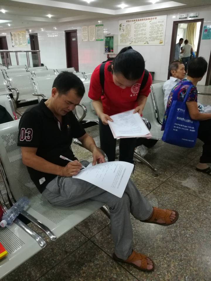 采访过护士后,队员们马不停蹄的开始发放问卷。发放问卷是进行实地调研的一个重要手段,也是实践队伍了解民情民意的一个重要途径,所以实践队员们也充分利用宝贵的实地调研时间来扩大样本数量。