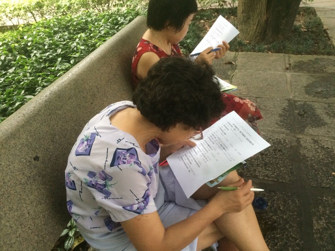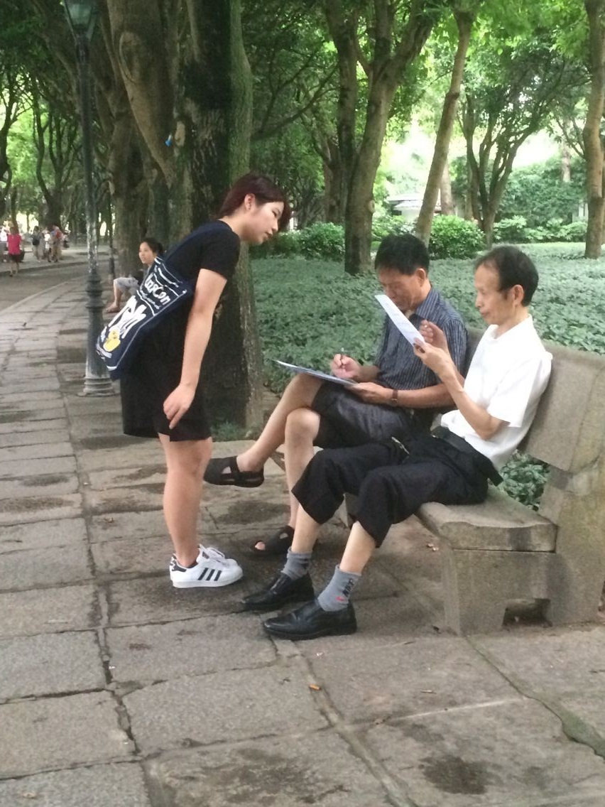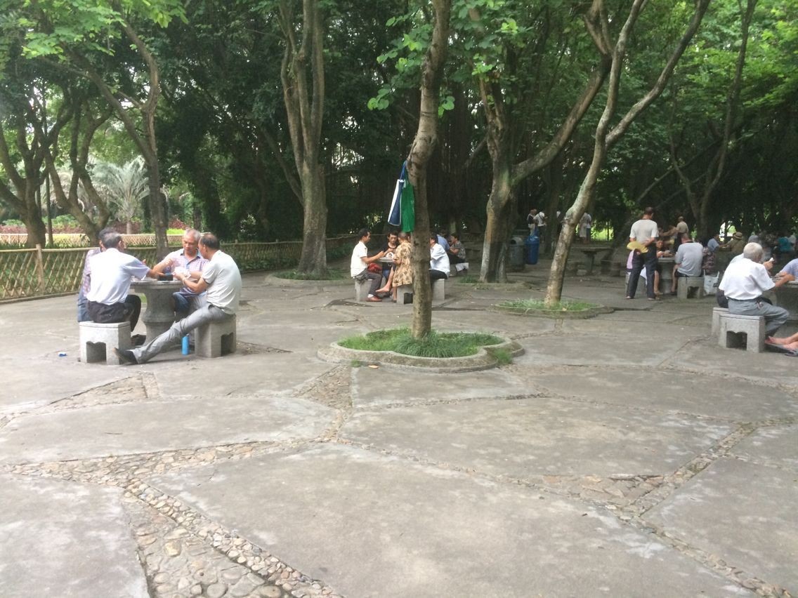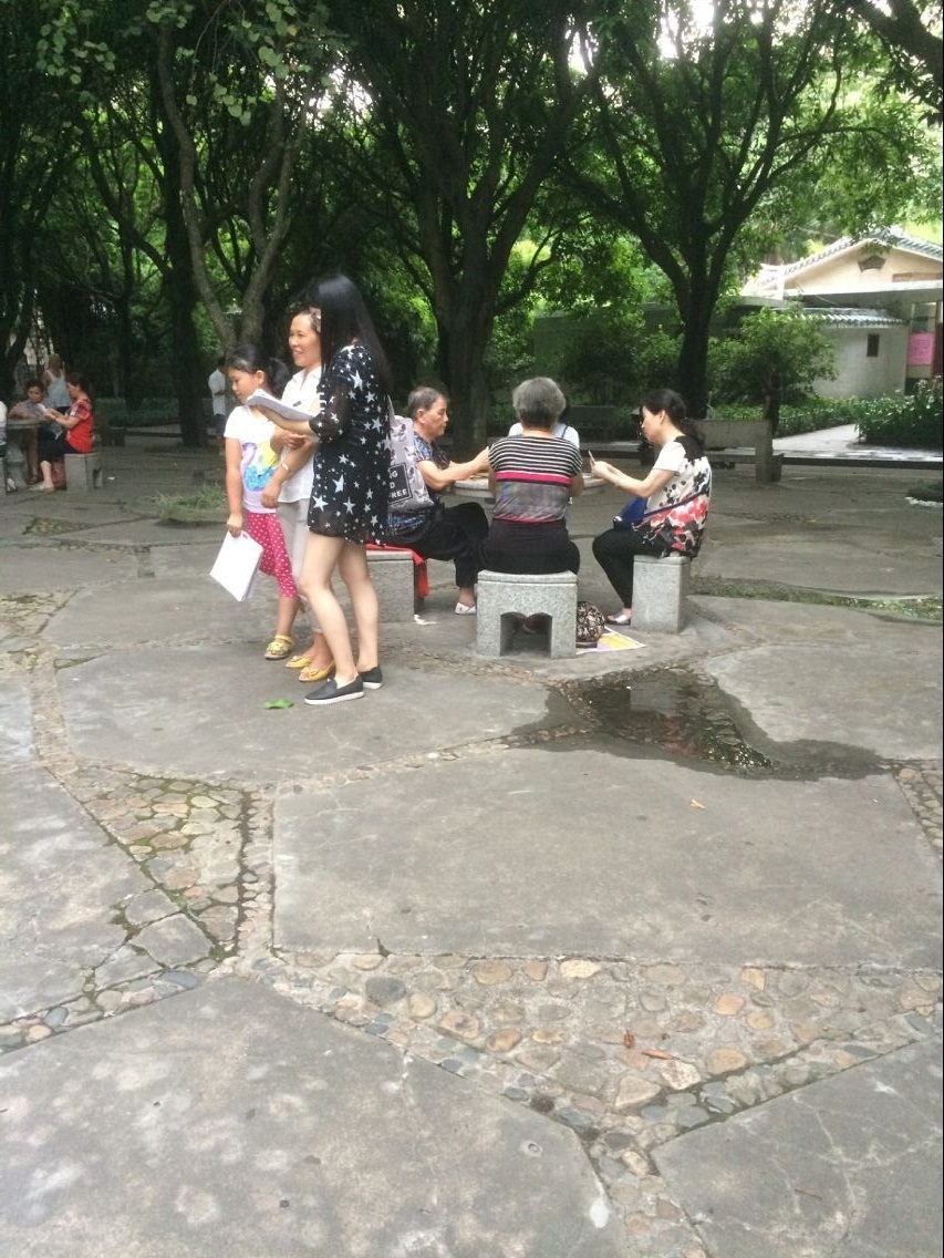 傍晚五时,Young老实践队的五名队员准时在南门公交车站集合,准备前往中山公园。由于巧好碰上下班的高峰期,路上堵车不断,我们大概于五点三十分到达中山公园。而此时中山公园里也是人流满满,我们不禁欣喜,想必定能收获很多一手资料。我们经过讨论,决定分开行动,这样可以遍布的范围更广,也能更好地提高效率。这个时间段,许多中老年人在饭后到公园乘凉或者散步,更多的则是已经约好了伙伴开始了打牌、下棋等丰富多彩的活动。