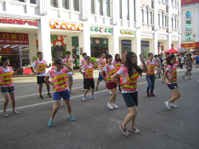 七月七日下午四时三十分左右,一群来自厦门大学漳州校区的“不速之客”偷偷潜入到了厦门市中山路的游人当中。这些人要做什么,除了他们自己,谁都不知道。但是不久,他们身上阳光可爱的队服和橙亮耀眼的环卫马夹就出卖了自己。对!他们就是厦门大学“星动夏辰”实践队的16名队员们。随着一声悠扬的音乐声起,精彩的一幕出现了:队员们纷纷丢下手中的物品,站成了整齐的队形,开始翩翩起舞。快闪的音乐活泼动感,由中日韩三种曲种构成;舞蹈动作集合了华尔兹、爵士、拉丁等多种风格,简洁大方、变化多端,充分体现出了“快闪”的特点。队员们跳得认真卖力,虽然说动作未必做得十分优美,但大家的态度和表情都特别到位。新鲜华丽的“快闪”引来了路人的强势围观,游客和居民们开始对这群身着“奇装异服”舞蹈的人充满好奇,继而是对实践队员们的啧啧称叹和拍照留念。当队员们跳完精心排练的舞蹈后,大家一起高呼“感恩环卫,垃圾分类;爱护环境,从我做起”的活动口号,这引起了围观群众们热烈的掌声;随后实践队员拉出了实现准备好的宣传环卫的条幅,路人们纷纷上前签名,支持这次公益活动。