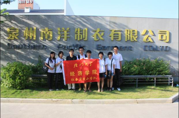 奔赴企业的小分队走访了台商创业基地黄塘。队员们首先到达南洋泉州制衣有限公才司,在来自台湾的副总经理陈历仁的带领下参观了制衣公司的厂房。厂房里有许多车间,经陈副经理介绍,车间里的工人们按流水线每天可以生产100至150件成衣,具体情况依成衣要求而定。经过参观,队员们对制衣过程有了一个基本的了解,接下来又与陈副经理进行了座谈。陈副经理与我们讨论了“两免三减”等政策,并提出由于内地经济的高速发展,台湾制造业在技术方面的优势已慢慢减退,劳动力市场开始出现短缺,但运输成本高使得公司往内地搬移较为困难,因而像制衣这样的传统行业也正在面临越来越大的竞争压力。同时,内地经济的发展使得有些大学生急功近利,价值观发生了极大的变化,越来越多的人涌向服务业而非制造也是劳动力短缺的原因之一。陈副经理的一番话使队员们陷入了沉思,受到了极大的启发。座谈会结束后,队员们与陈副经理合影留念。紧接着,队员们又走访了南洋制衣厂隔壁的国花密胺制品有限公司,了解到了麻将的制作流程,从印模、点漆、审查、打磨到充磁,并与蔡董进行了简单的座谈。蔡董告诉我们由于社会对公平的追求,政府对台资企业的优惠政策正在慢慢取消,劳动力短缺给企业造成了很大压力,现在企业正在规划向内地迁移并已在内地设置了一些分厂。座谈会结束后,队员们与蔡董合影留念。