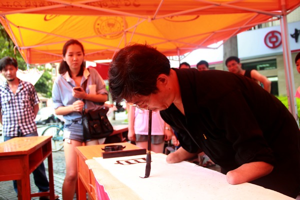 本次公益活动由上午11点持续到下午3点,着重展示了各式各样的残疾人手工艺品。一个个用珠子连缀成的“兔子”、“猴子”、“熊猫”模样可爱,“腾龙”栩栩如生,还有各种外形美观的小装饰品,引起了许多过往行人甚至外国友人的好奇和兴趣。在蛋壳上雕刻出各种精细图画如“八骏图”、“高山流水”等的蛋雕艺术也令人叹为观止。更令人惊叹的是,失去双手的残疾人书法家口衔毛笔,现场作书,其“口写书法”的功力深厚,令现场观众折服。