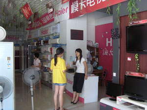 下午,顶着烈日,我们又走访了两家海尔电器专卖店。这两家专卖店均设有家电下乡电器专柜,而且空调、冰箱、洗衣机、彩电、手机都有专门的分类和具体的标识。根据店内销售人员反映,家电下乡政策实施以来,销售业绩有了一定的增长,其中以冰箱的销售尤为突出。