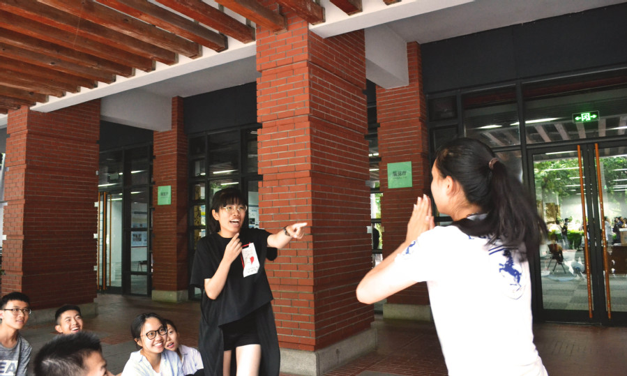 随后,大家被分成不同的小组。每个小组聚在一起,席地而坐,开始进行自我介绍。名字配上独一无二的动作,变成了每个人的特别开场。一块神秘的幕布挡住了对方,在幕布揭开的那一刻要立刻说出对方的名字并做出他的标志动作。幕布后面总有惊喜连连,面对面激动的表情、引人捧腹大笑的搞怪动作、瞬间“击败”对方的欢呼拍掌……因为对志愿满怀期待,大家聚首于此,从前还觉得生疏的名字相貌,现在早已刻在彼此心中。