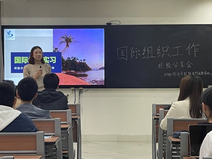 为了扩展同学们的国际视野,增进同学们对国际组织的了解,2021年11月20日上午,厦门大学经济学院就业创业指导中心于经济楼N308举办了国际组织工作经验分享会。本次活动邀请到了厦门大学学生处就业创业指导中心黄静遥老师、厦门大学2019届社会工作专业硕士刘琳学姐、厦门大学南洋研究院世界经济专业在读硕士生韩喜学姐,她们生动的讲解和耐心的解答, 得到了参会人员的一致好评。