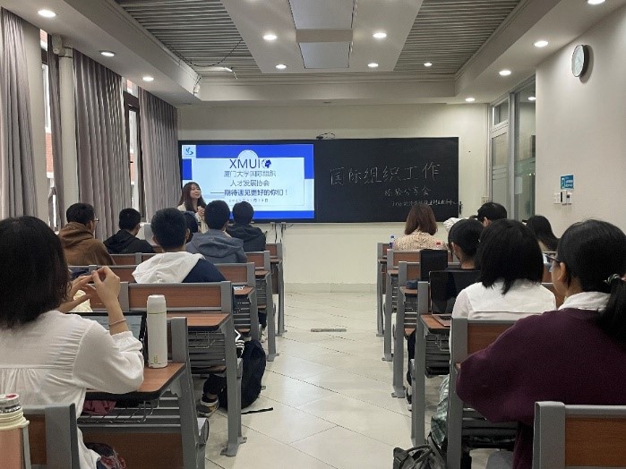 韩喜学姐则是对厦门大学国际组织人才发展协会(XMUIO)进行了宣讲。在中国的话语权日益增强这一国际化大背景下,该协会应运而生,并且在培养输送青年人才方面发挥了重要的作用。她具体介绍了该协会主要举办的四个活动,即“厦际之声”实践活动、“我是外交官”全国大学生外交风采大赛活动、讲座和“国际组织分享会”系列活动。