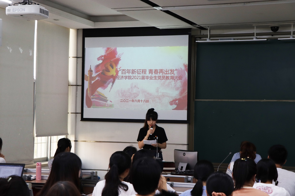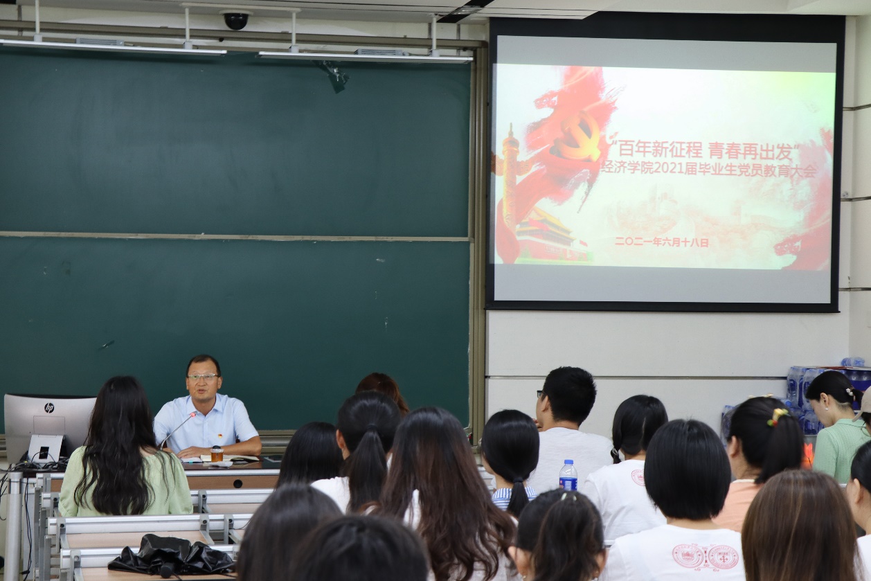 6月18日下午,经济学院党委在经济楼D136举办了“百年新征程 青春再出发”2021届毕业生党员教育大会。经济学院党委副书记杜海林老师、团委副书记赵小姝老师、辅导员刘慧老师及部分毕业生党员参加了此次会议。会议由2021届本科毕业班党员卓文康主持。会上,院党委副书记杜海林老师作“学思践悟 行稳致远”毕业生党员党史及廉洁教育专题讲座。