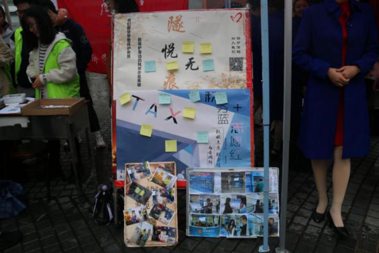 “与会同行”和“不负韶画”的队员积极做好准备工作,搭起帐篷,搬来桌子和展板,贴起海报,摆好奖品。寒风凌冽,但未吹冷他们进行路演活动的热情。他们穿上志愿者的小绿服装,向前来参观路演活动的同学宣传税务局和芙蓉隧道的志愿活动,并讲述关于他们的税务局和芙蓉隧道的志愿故事。