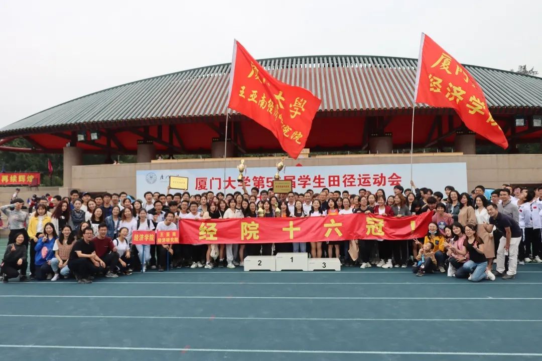 11月6日至7日,厦门大学第55届学生田径运动会在思明校区演武场和上弦场隆重举行。经济学院、王亚南经济研究院(以下简称两院)的全体师生意气风发,昂扬向上,以本科生总分第一、研究生总分第一,团体总分第一的骄人成绩,创造了十六冠的辉煌,书写了厦门大学校运会史上新的传奇。同时,两院也凭着在日常体育教学组织工作中的出色表现,荣获厦门大学2019-2020年度体育竞赛总分冠军和“体育先进学院”的称号。
