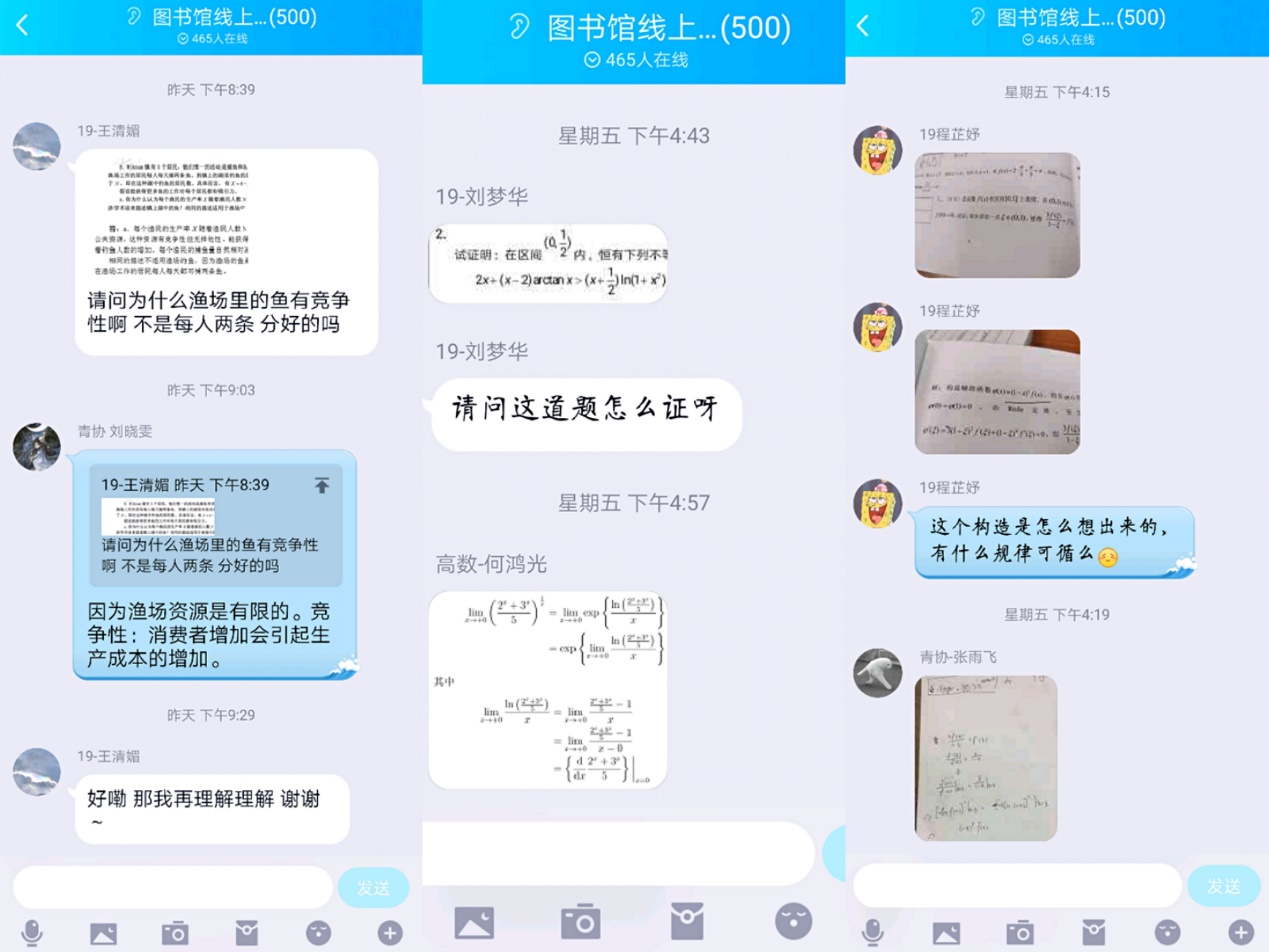 而在无人前来咨询时,答疑志愿者们也不会让自己空闲,他们会在经院官方图书馆答疑群中为因有事不能前来的同学进行线上答疑,针对每位同学的问题作出回答并将详细过程写在纸上发在群里,线上答疑并无固定时间,即使不是周五晚,答疑群中也会有志愿者为大家解决困难。