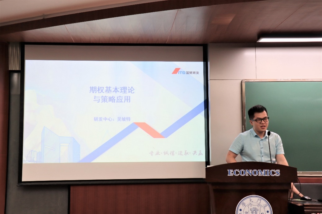 随后,国贸期货有限公司研发中心分析师吴坡特师哥带来了《期权基本理论与策略应用》的专题分享,既解答了同学们的疑惑,又丰富了同学们的知识。
