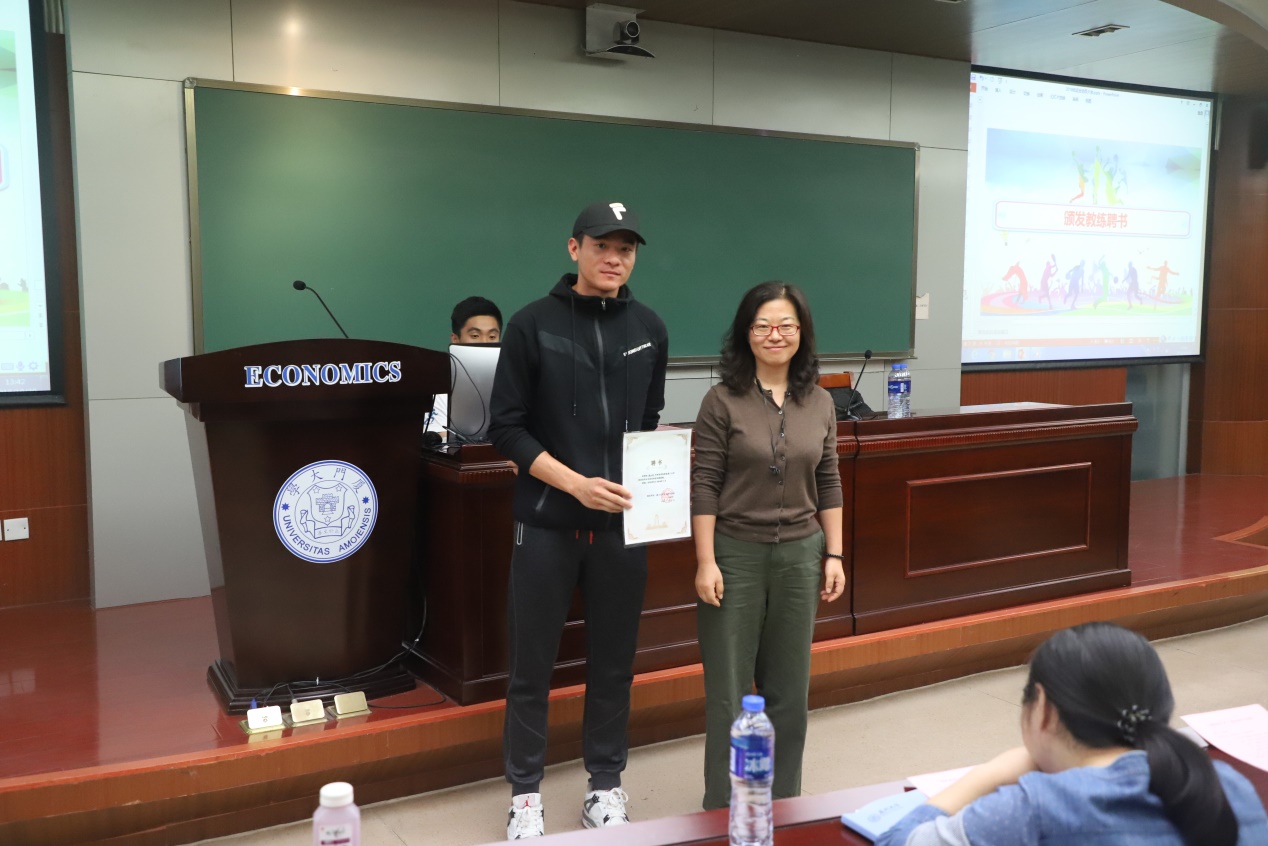 经济学院党委副书记邱旺土寄语。邱书记首先表达了学院对学生运动会的重视与支持。他形容道,历届经院学生对运动会都怀着一种特殊情感,作为经院每年参与程度最高的盛事,运动会是最具节日气氛的活动。接着,邱书记向运动员、教练员、辅导员、学生干部们表示感谢,感谢大家克服重重困难与压力,赞赏大家艰苦卓绝、坚持不懈的精神。最后,邱书记还对运动员和后勤人员提出了几点意见,希望今年的经院健儿奋勇争先,续写辉煌,赛出风格,赛出水平,赛出成绩!随后,党委副书记周蕾向翁士洋教练颁发教练聘书。