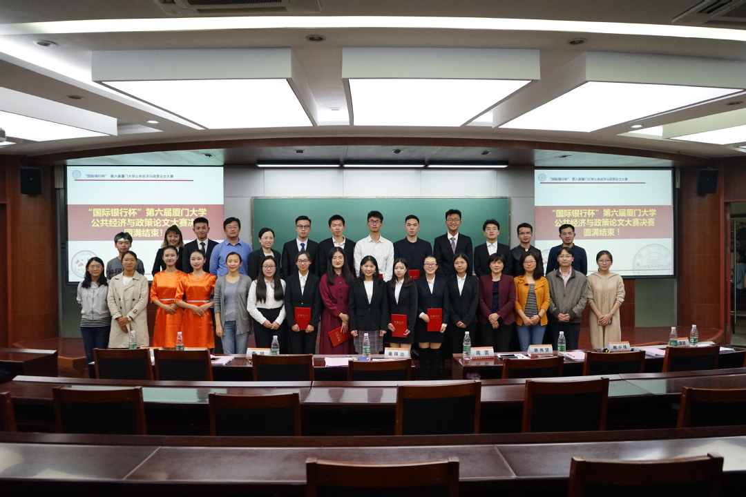 11月30日晚,“国际银行杯”厦门大学第六届公共经济与政策论文大赛在经济学院N302顺利举行。大赛有厦门大学教务处、共青团厦门大学委员会、厦门大学经济学院主办,经济学院财政系、经济学院学生科创中心承办,厦门国际银行赞助支持,经济学院党委副书记周蕾、财政系主任童锦治出席了决赛,大赛决赛由财政系童锦治教授、蔡伟贤副教授、李培副教授、鲍小佳助理教授、丁锦秀助理教授担任评委,经济学院辅导员徐惠聪、刘长青也参加决赛。