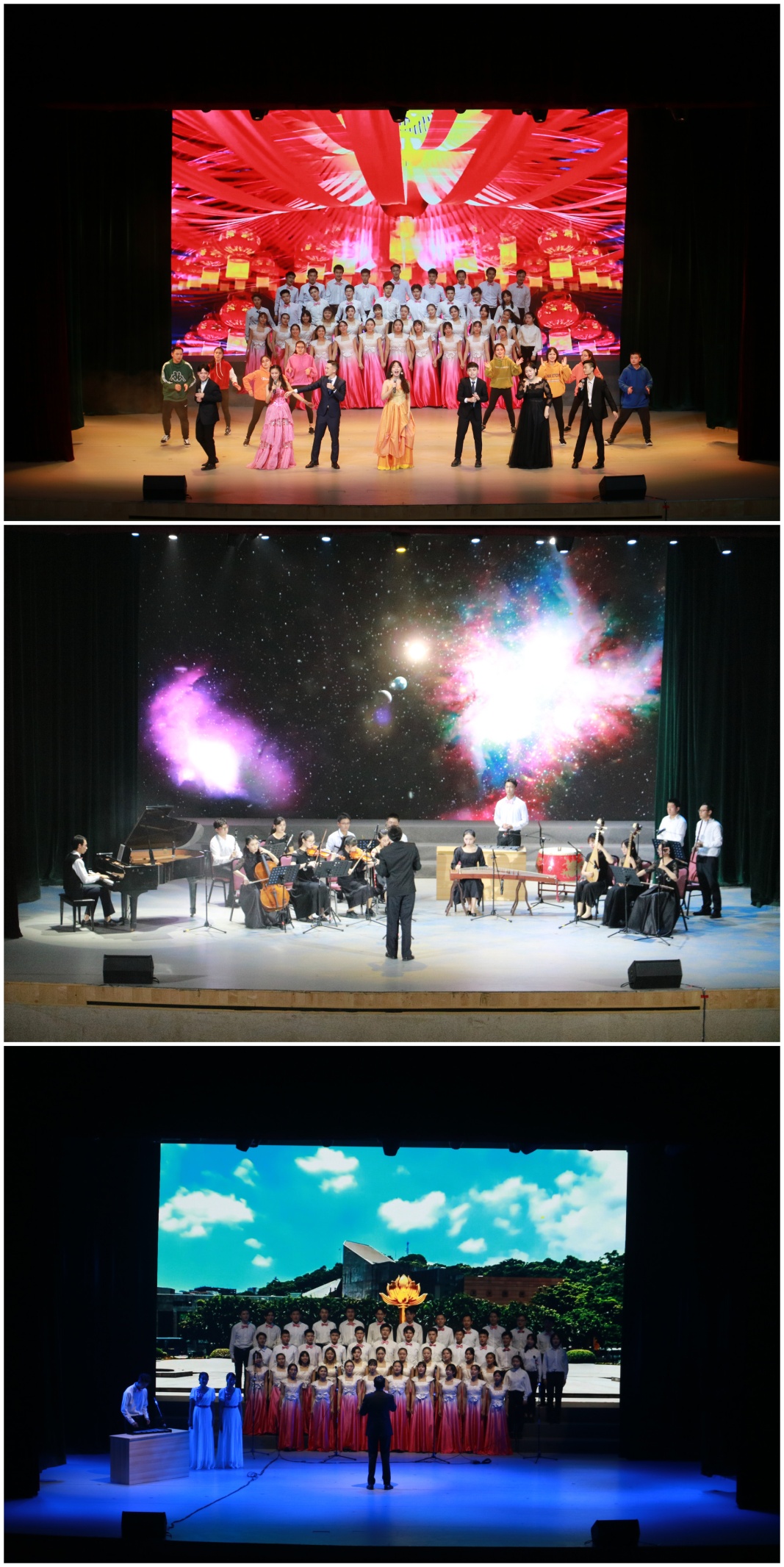 歌手赛暨文艺汇演分为“建国之初”“中西之汇”“民族之兴”“奥运之盛”“社会之强”和“未来之约”五个篇章。一曲《相亲相爱》拉开演出的序幕,经院舞蹈队古典舞《纸扇书生》,将人们拉到了那个“春日游,杏花吹满头”的时空;新十佳歌手的首秀,通过一个家庭里三代人的情景表演,采用倒叙方式,将五首不同年代的歌曲串烧,带观众回味改革开放40年来流行音乐的变迁;中西乐器合奏《海绵宝宝》《克罗地亚狂想曲》和《刀剑如梦》发生奇妙的化学反应,给观众带来一场精彩绝伦的视听盛宴;相声《满腹经纶》诙谐的逗哏和机智的捧哏引得现场笑声连连;舞蹈《燃烧》以及啦啦操表演充分展现了经院学子的青春与活力;经院合唱团的《七子之歌》《Make A Song For My Heart To Sing》悠扬婉转,带领观众穿梭于音乐的时空隧道;最后《我和2035有个约》唱响大礼堂,歌声唱出了同学们飞扬的青春梦想,凝聚起新时代奋进的新力量。
