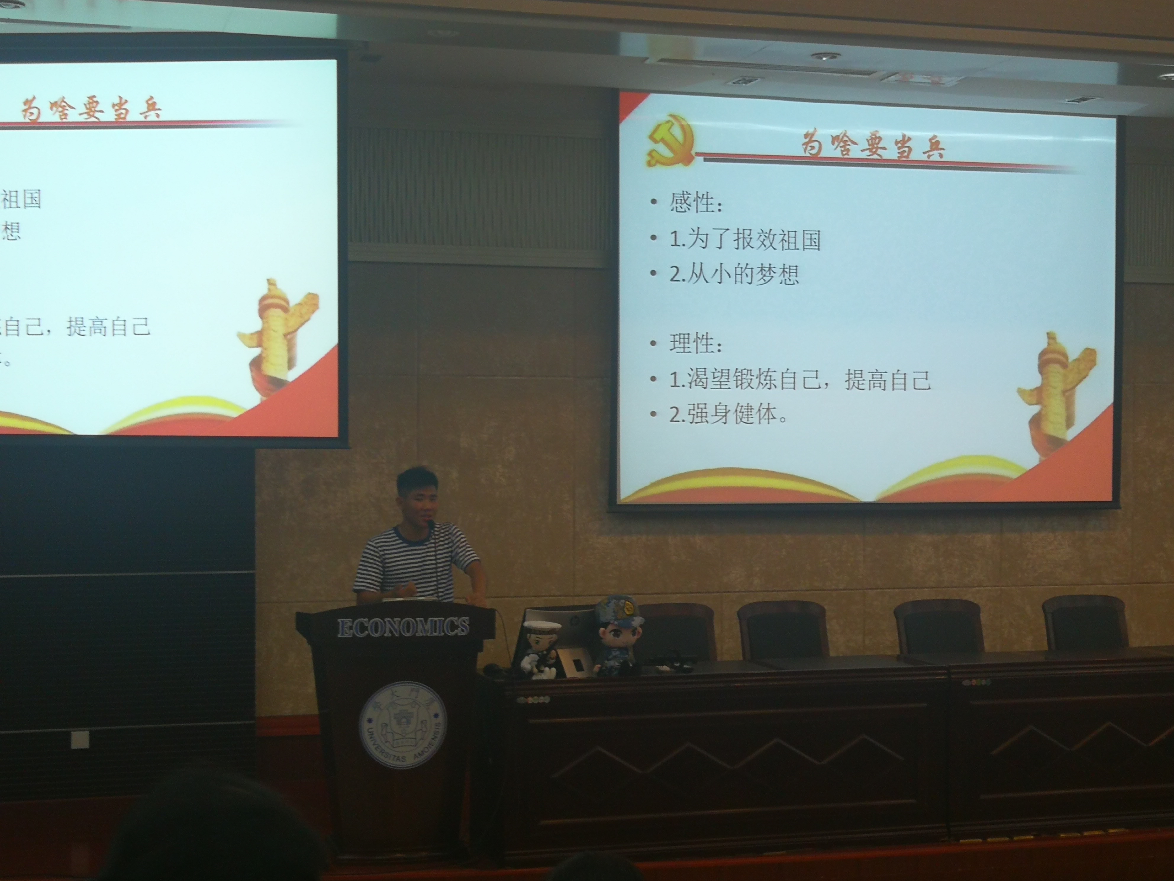 2018年5月28日,厦门大学经济学院新生国防教育专题讲座在经院楼N402顺利举办;主讲人,经院16级本科生,宋心泽为经济学院2017级全体本科生上了一节别开生面的国防教育课。学生工作处人民武装部王旖妮老师参加了本次活动。
