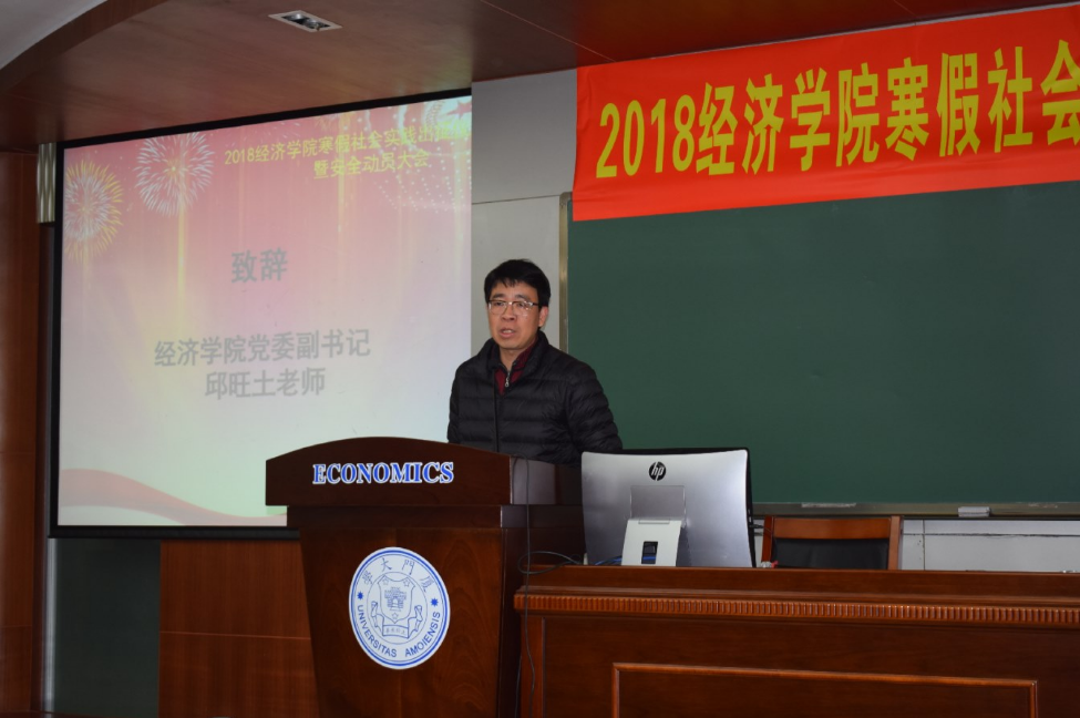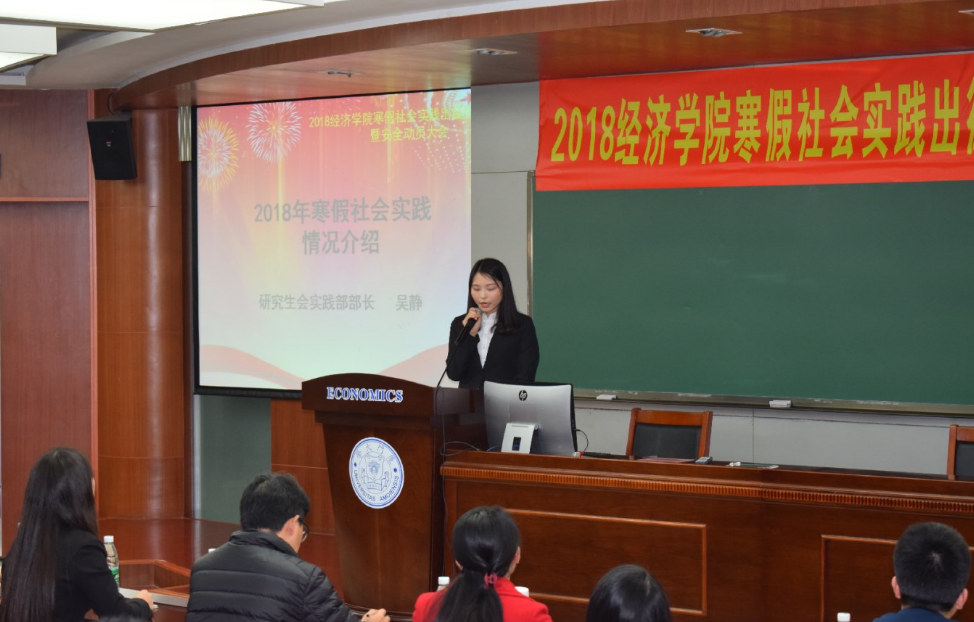 2018年1月8日下午,由共青团厦门大学经济学院委员会主办、经济学院研究生会实践部承办的经济学院2018年寒假社会实践出征仪式暨安全动员大会于经济楼N302教室圆满举行。大会对2018年寒假社会实践做出部署,并就实践中的安全问题做了专题动员。院党委副书记邱旺土老师,院团委副书记陈启妍老师,辅导员林轶凡老师、刘长青老师出席了本次大会。