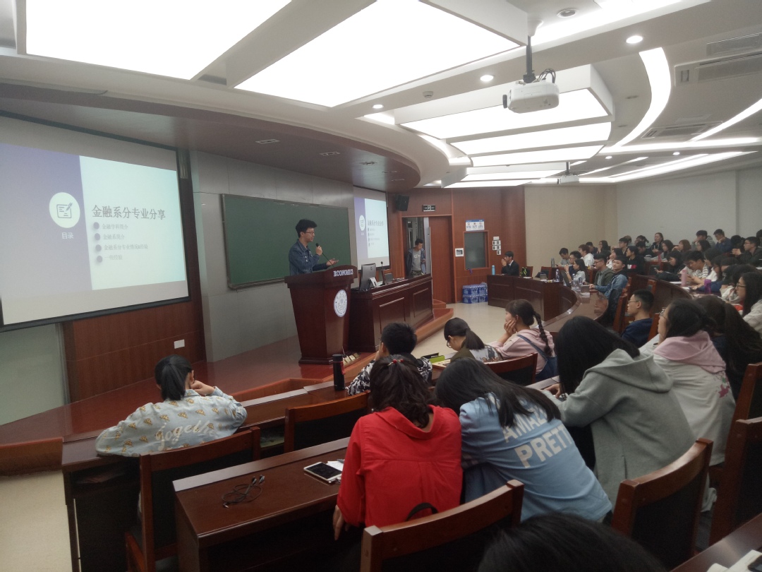 除了对本专业课程、保研、考研、实习和就业等方面做了基本介绍,他们还都带来了富有个人特色的干货知识。幽默风趣的高昱达同学首先旁征博引地就金融系学习与未来就业做了富有前瞻性的讲解,并指出了实习的重要性,同时也提到金融系的竞争压力较大;贴心的范怀远同学别出心裁地将重点放在财政系独有的模块化课程设置上,还阐明了财政系课程在考取相关职业证书如CFA、CPA等方面的优势;另辟蹊径的陈果同学娓娓道出了经济系的兼收并蓄,并介绍了行之有效的学习方法;周晓岩同学切实地为同学们对分流方案做了解读,并强调了统计专业对数学学习方面的较高要求以及课程安排;林海亮同学通过一些的现实案例与数据向我们展现了国贸系专业的宏远前景以及国贸系的巨大潜力,并表示欢迎学弟学妹加入国贸大家庭。
