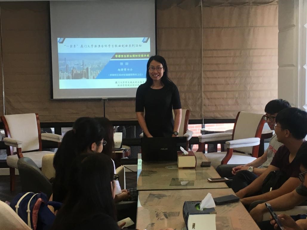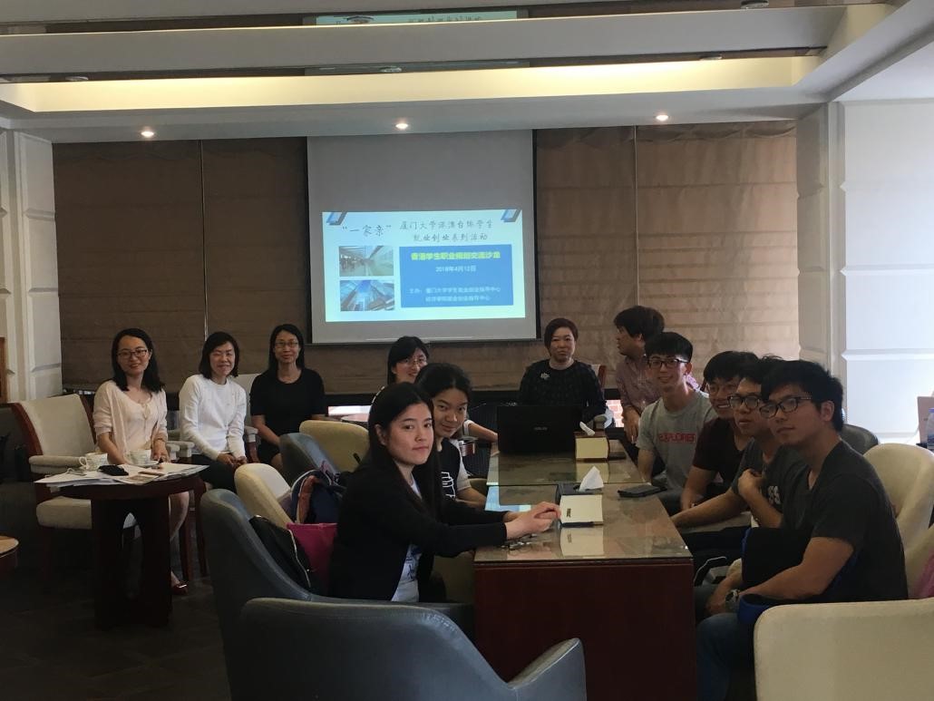 2018年4月12日下午,由厦门大学学生就业创业指导中心、经济学院就业创业指导中心共同举办的“一家亲”厦门大学港澳台侨学生就业创业系列活动之香港学生职业规划交流沙龙在经济楼三味咖啡厅顺利开展。此次活动邀请香港特区政府驻福建联络处主任赵碧菁女士、副主任英淑欣女士,以及香港永明金融有限公司高级财务策划经理陈洁珊女士作为宣讲嘉宾,党委学生工作部(处)杨文安老师、任艳青老师、经济学院陈启妍老师参加了活动。