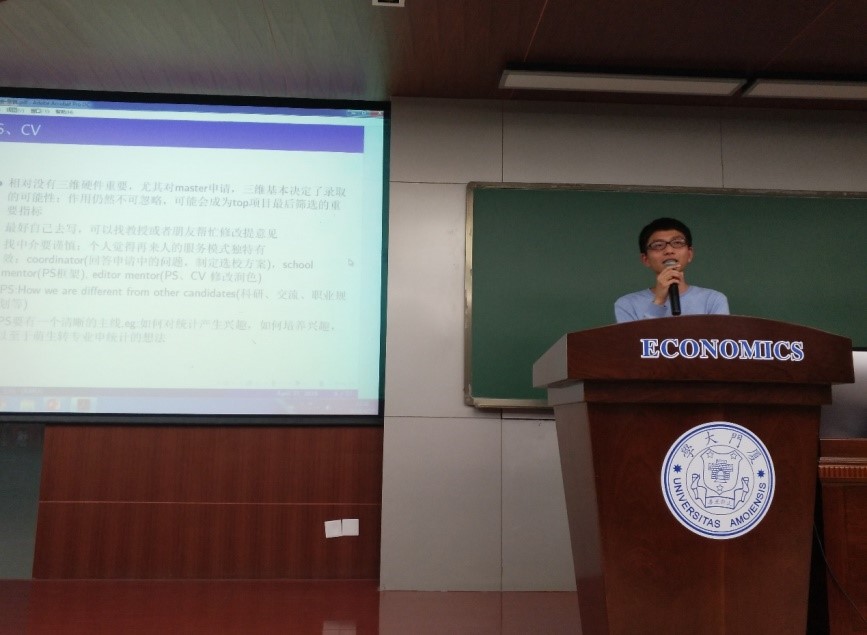 首先统计系的葛亚炜同学为同学们分享了申请美国统计学博士学位的经历,着重介绍了准备推荐信的渠道和方法,强调了科研经历对申请的重要性。