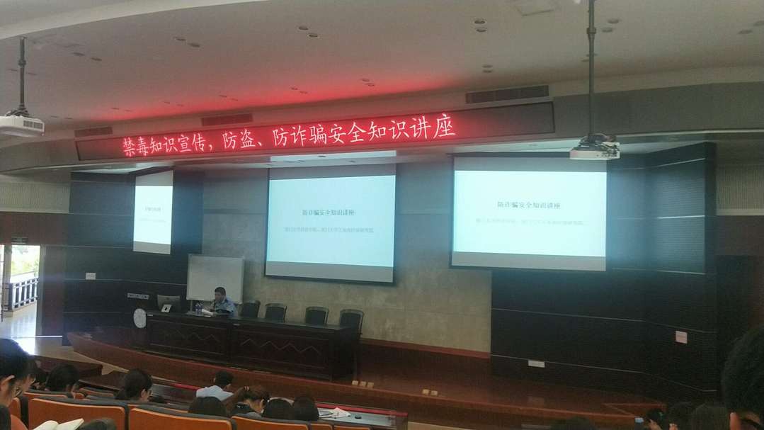 主讲内容分为禁毒知识,防盗和防诈骗三大部分。季警官以同学们身边的例子,说明了毒品的隐蔽性,并列举了几种现在毒品常见的伪包装,混杂在咖啡,茶等饮品中,或以精美的糖果包装等形式。建议同学们不去人员混杂的酒吧、夜总会等,以免被动吸毒而成瘾。