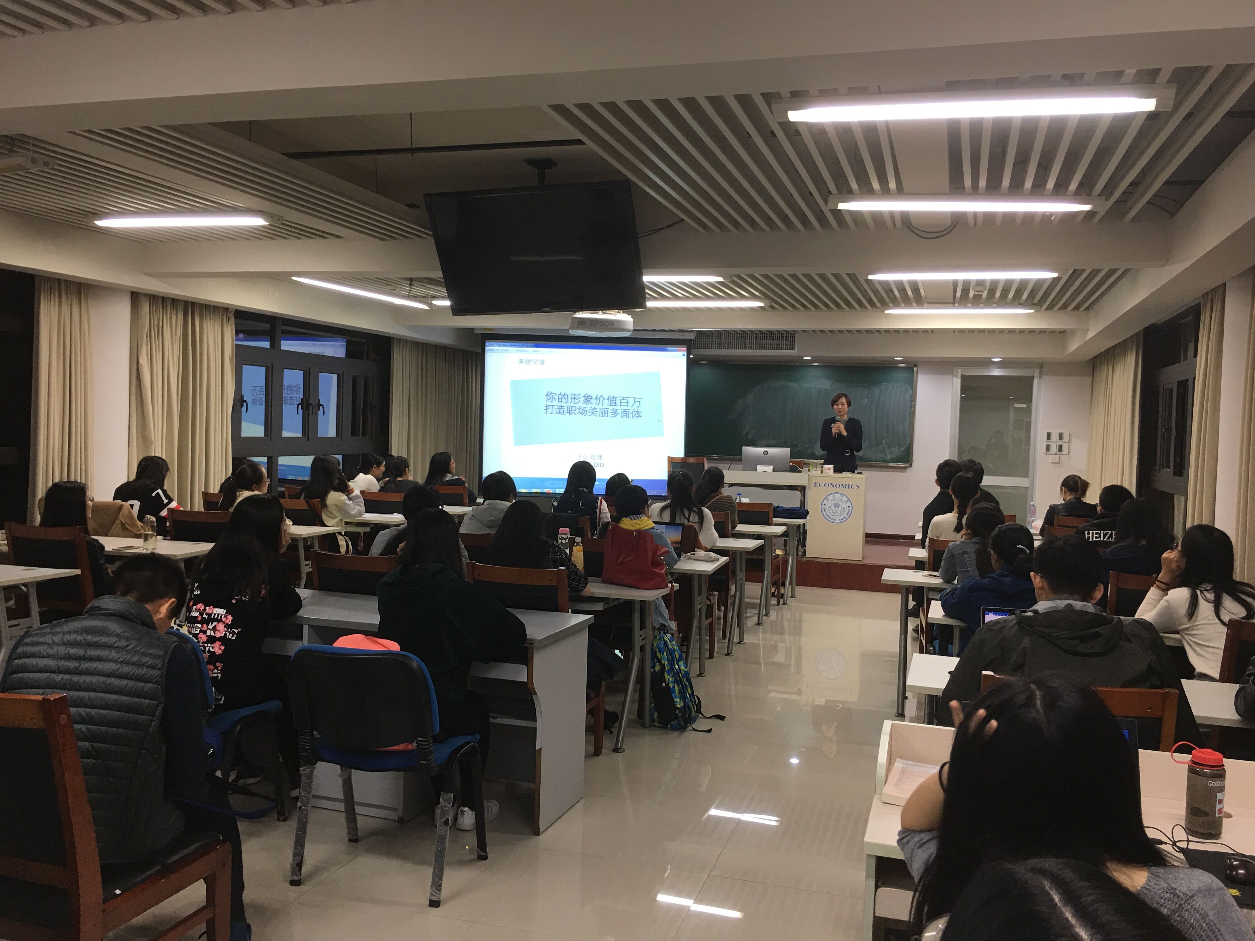 2017年11月19日晚七点,由厦门大学经济学院就业创业指导中心主办的“职场对对碰”系列之职场礼仪与化妆培训讲座在经济楼N401准时开讲。该活动旨在通过邀请于职场化妆礼仪方面有着深厚专业知识的嘉宾为同学们带来相关方面的知识讲解与现场培训,让大家能在职场初试中凭借妆容仪表占得先机,为大家的求职之路保驾护航。本届活动中心邀请到来自玫琳凯公司的形象顾问王欢女士为同学们带来职场知识干货与实操相结合的分享,吸引了诸多同学热情参与,现场座无虚席。