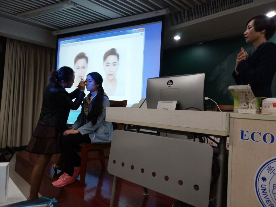相较男生,女生的职场仪表有更多值得注重的地方,王欢女士则从仪表、仪态、仪容、礼仪四个方面着手介绍,同时在现场请同学作为模特进行实操演示。她先以四季来总概女生的装扮气质类型,之后马上开始了职业彩妆知识的具体传授,依次是底妆、眼妆、唇妆与修饰部分。在助理的帮助下,嘉宾的讲解与模特化妆有条不紊地同步进行,细致的知识介绍中不时穿插着有趣的故事与和同学的互动玩笑,现场气氛融融,笑声连连。