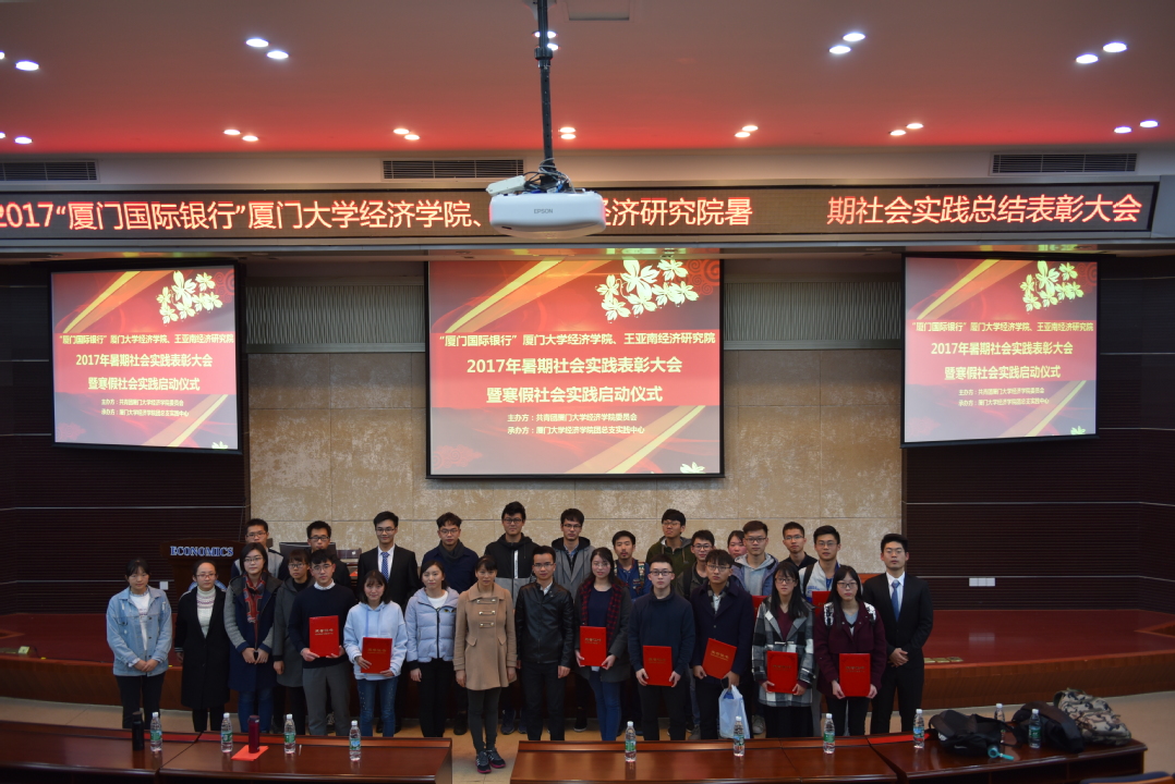 12月18日下午,“厦门国际银行”厦门大学经济学院、王亚南经济研究院2017暑期社会实践表彰大会暨寒假社会实践启动仪式在N402顺利举行。学院党委副书记王艺宏老师、团委副书郑淑真老师、辅导员袁愉年老师、刘慧老师、刘长青老师,经院国际教育合作中心林嘉欣老师出席了大会,经济学院团总支学生会主席团代表、各实践队代表、2017级本科同学及实践中心全体工作人员也参加了本次大会。
