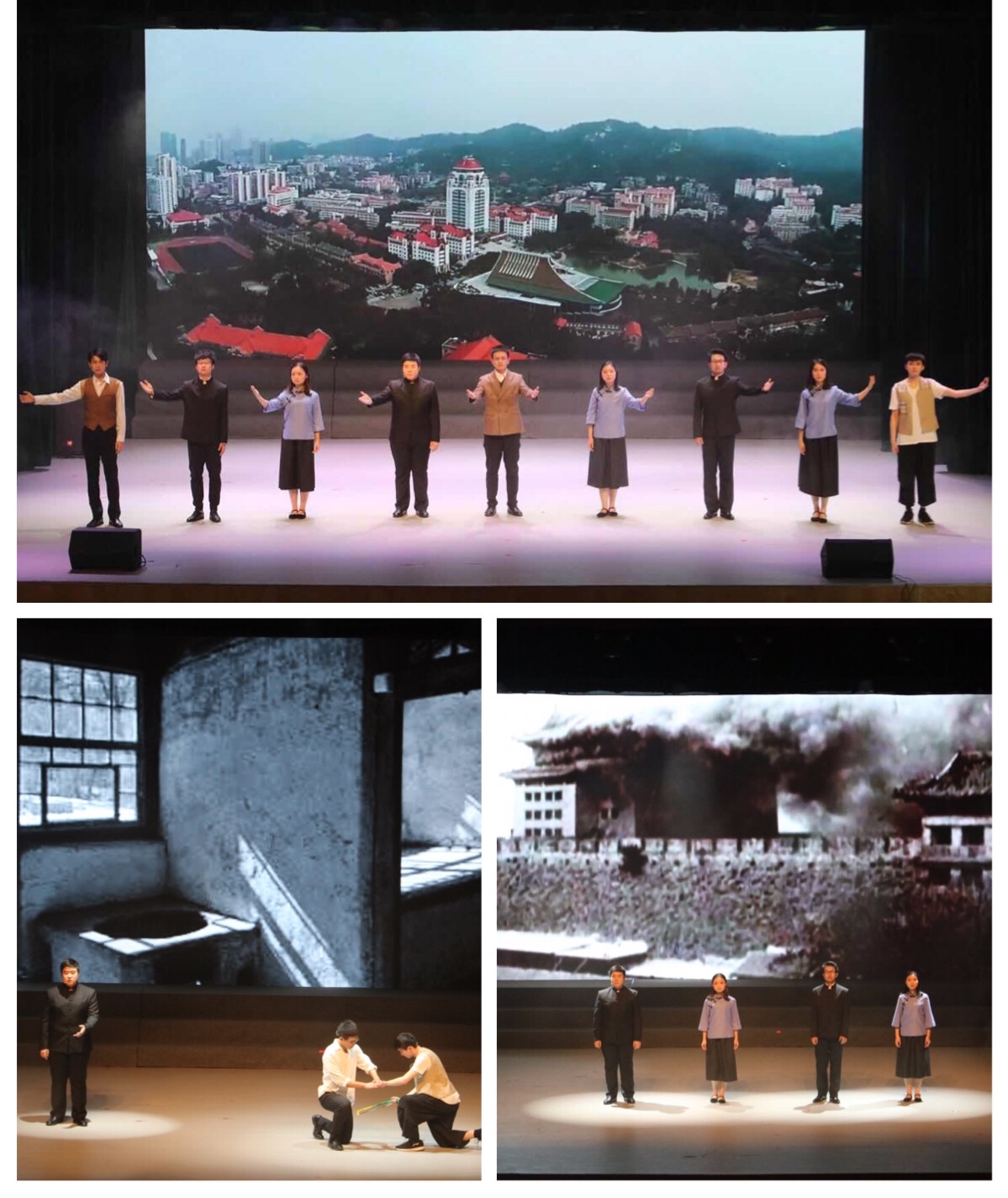 在晚会正式开始前的暖场环节中,经济学院、wise2017级本科生以班级为单位拉歌,同学们激情昂扬,唱响青春、歌颂祖国,展现了“班班有歌声”的良好风貌。晚会第一篇章旨在展现青春与梦想。啦啦操队用充满激情与活力的舞蹈拉开晚会序幕。接着,观众们在组曲《青春进行曲》的明快旋律中与沙画《生命曙光》的温柔笔触下,开启了一场梦的旅行。随后,院主持人队用一场深情、感人的原创诗剧《亚南故事》,还原了亚南校长的自求学、从戎到教学、科研的人生经历,歌颂亚南校长自强不息、心系天下的伟大抱负和矢志不渝、追求真理的科学精神,在亚南校长逝世50周年之际,表达了两院师生对老校长的深切怀念。