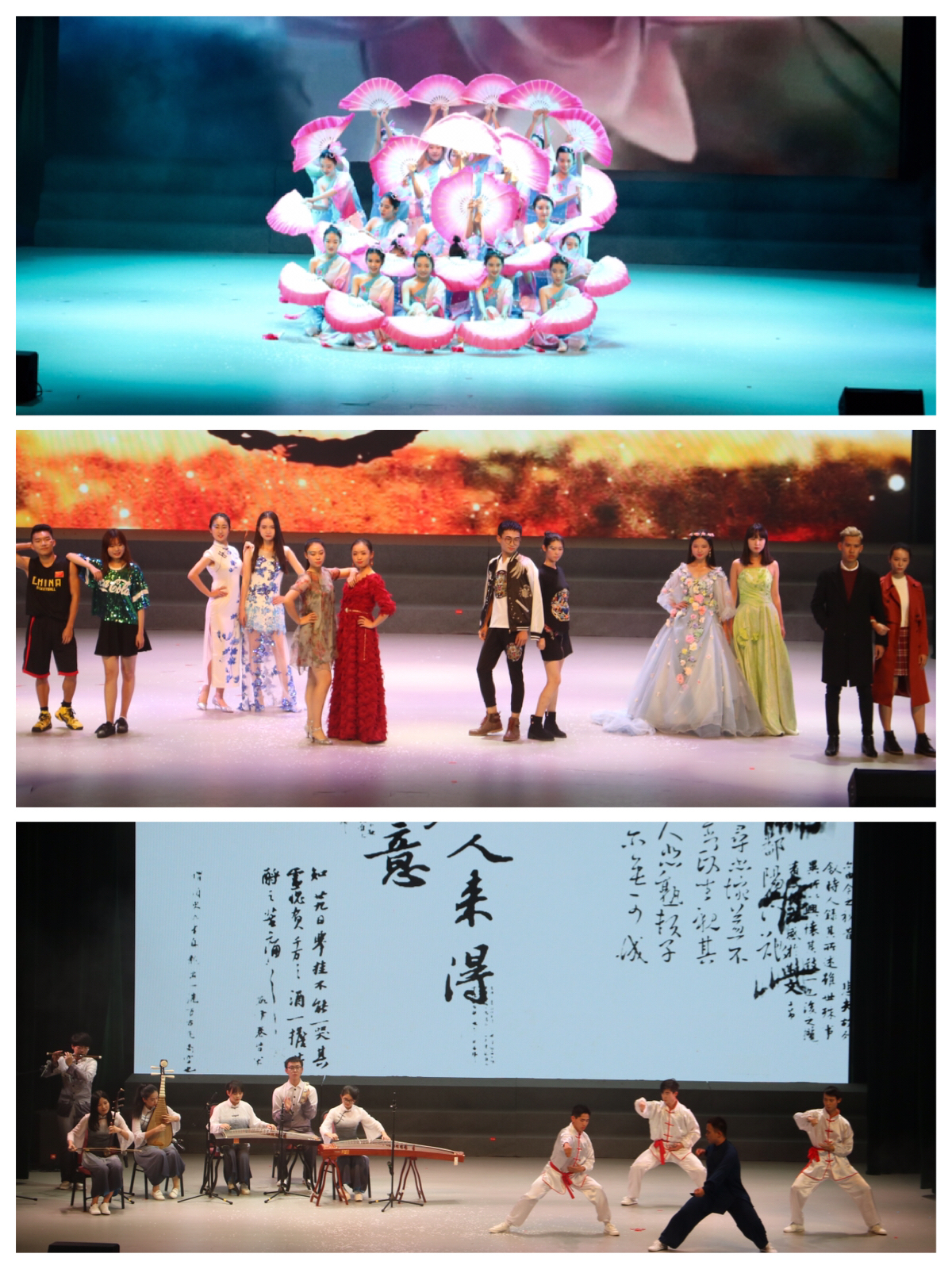 第二篇章旨在展示中华文化的博大精深,源远流长。舞蹈《荷风盛世》、民乐武术表演《兰亭序》、T台秀《中国·颜色》三个节目用民舞、传统服饰、民乐、武术等中华民族独有的传统文化元素,彰显了中华文化的丰富内涵。值得一提的是,在篇章间隙,两院本科生团总支、学生会为同学们送上了精致的原创对联,其中经济学院本科生团总支书记和学生会主席团成员送上的上联是“雄鸡送东 南强师生同守旧岁”,下联是“金犬迎春 经院团学恭贺新年”,横批“经世济邦”,将本环节推向高潮。
