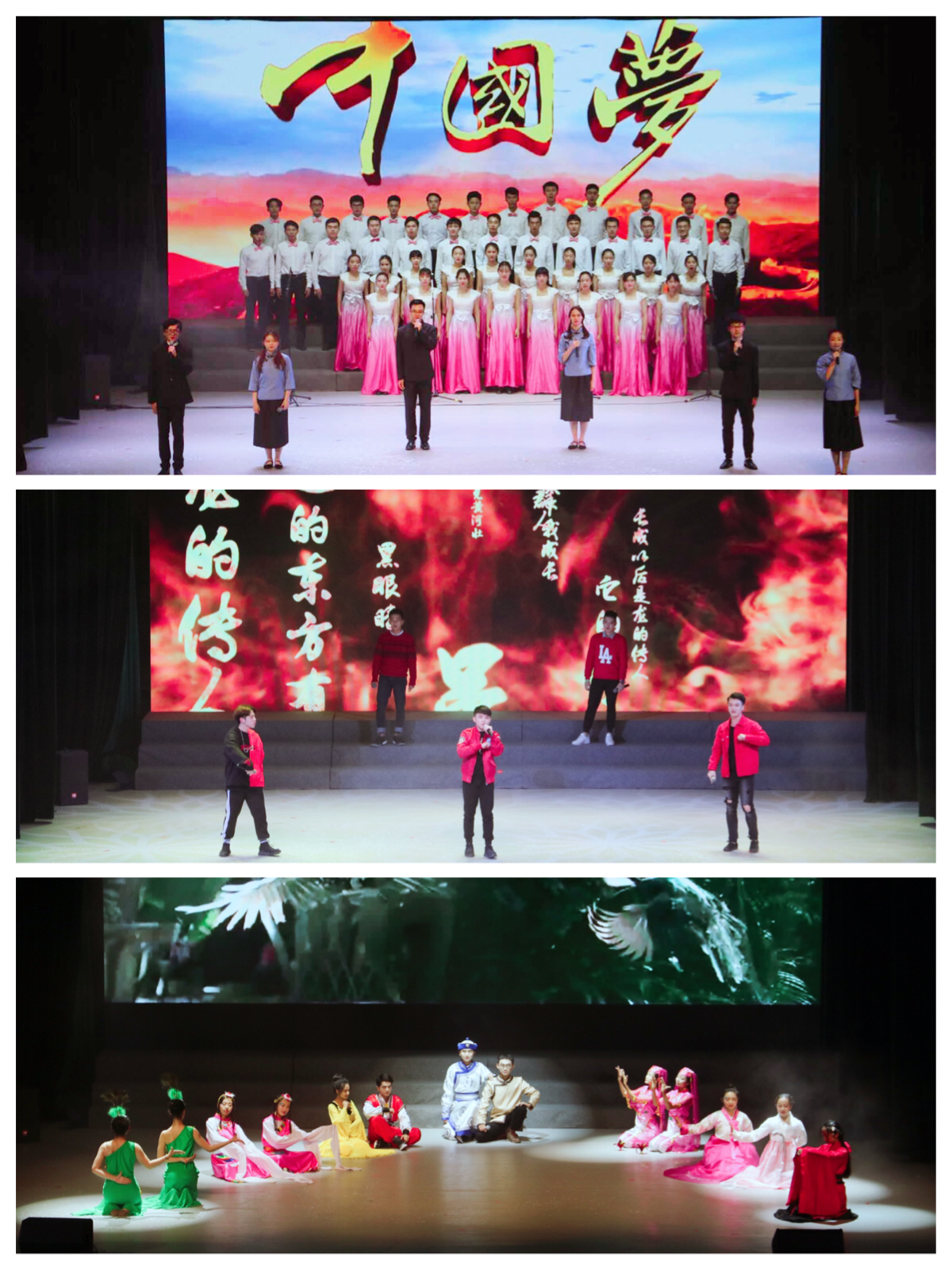 第三篇章展现了新时代的民族面貌。合唱队一首《复兴之路》铿锵有力地唱出了新时代的声音;朗诵队作品《献礼十九大,放飞中国梦》;来自傣族、藏族、维吾尔族、蒙古族、回族、朝鲜族和汉族的两院学子带来民族舞蹈串烧节目《民族大团结》,展现我国多元的民族文化;台港澳学子用一首《龙的传人》诠释了浓浓赤子心,掀起整场晚会的高潮。最后,晚会在金砖会议主题曲《厦门亲像一首歌》中成功落下帷幕。