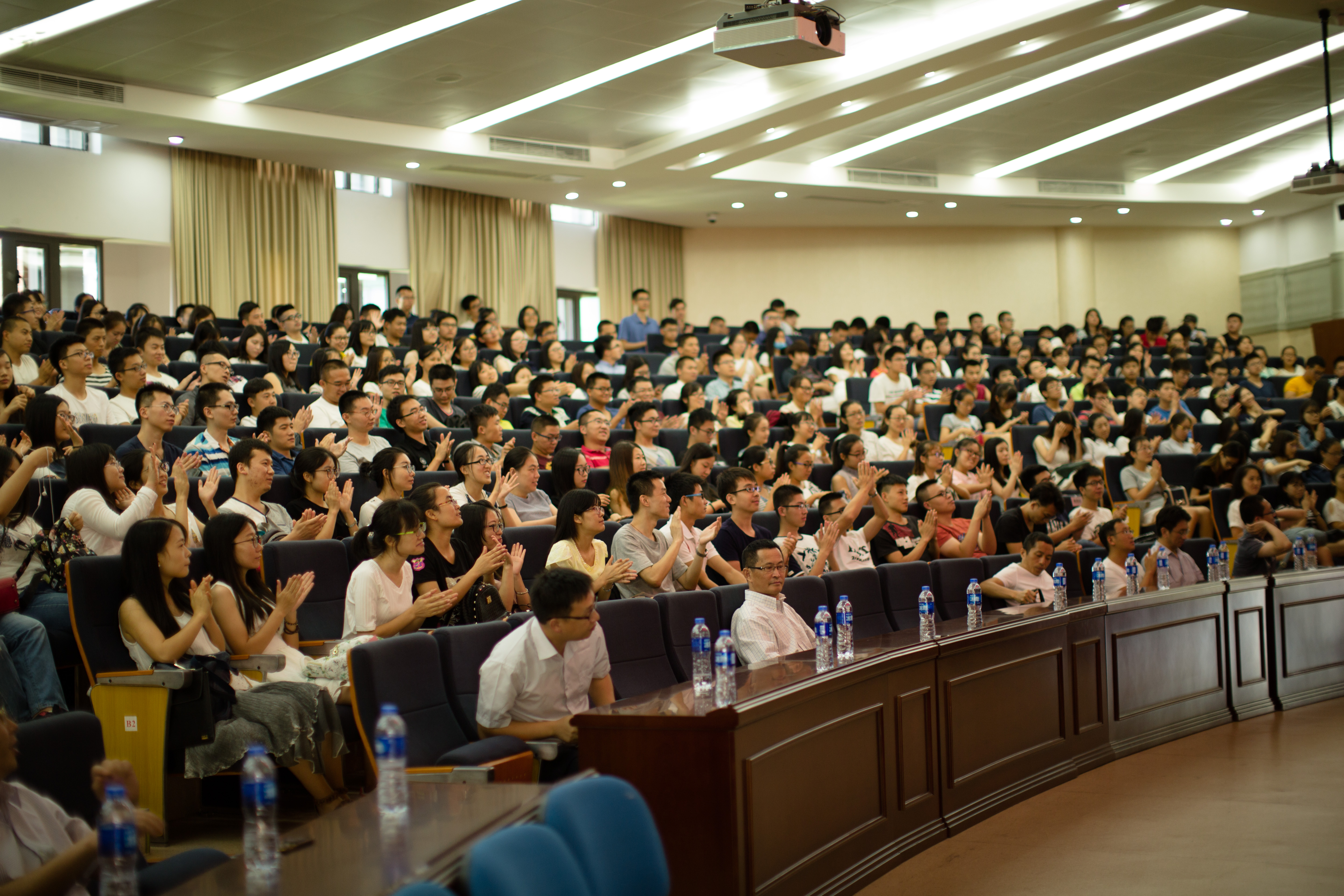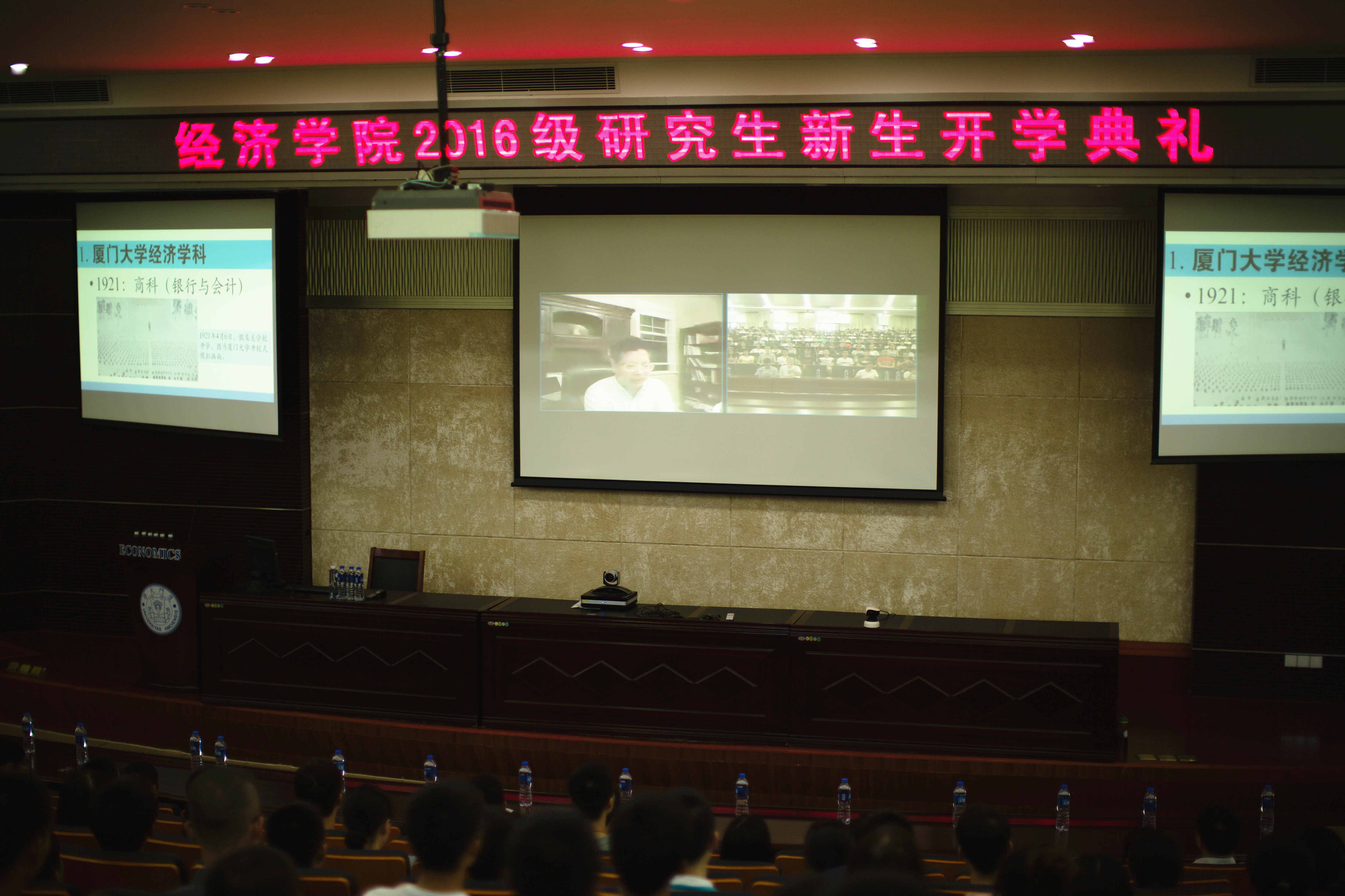 首先是院长洪永淼教授在康奈尔的视频致辞。他代表经济学院全体师生对2016级研究生新生的到来表示由衷的祝贺和热烈的欢迎。在致辞中,他讲述了经济学科的发展历史,回顾了经济学院从建校之初的雏形——商科,到如今成为国内少有的同时拥有理论经济、应用经济两个国家级重点学科的学院的整个发展历程。然后,洪院长以自己的求学经历给在座学生以启示,要珍惜校园生活,努力学习,珍惜所遇到的人,每一个人都可能给自己的人生带来转折。洪院长还表示,经济学院全体师生会共同建设优秀的师资力量、丰富的国内外学术资源、浓厚的学术氛围,为我院学生们提供良好的学习条件。致辞最后,院长对2016级新生提出四点建议,第一,好好学习,学习是学生最重要的事。第二,多维教育,要善于利用讲座、茶会等机会,增强学识。第三,纪律规范,要遵守学校、学院的规范制度。第四,心存高远,不要只看到眼前的利益,或者眼前的舒适,要有追求。