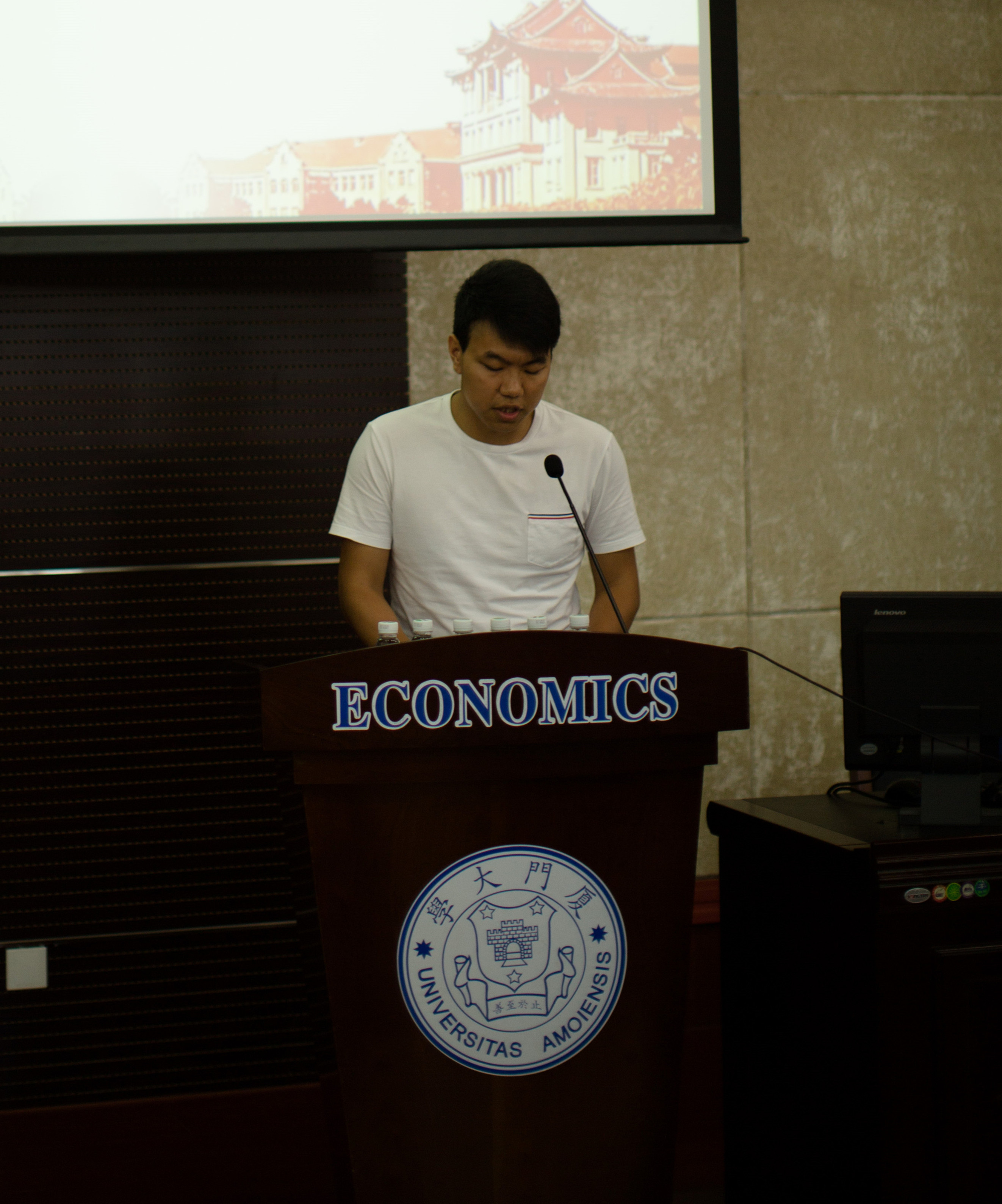 最后,新生代表、统计系赵宇同学发言。赵宇同学在厦门大学完成了本科学业,现在继续在厦大延续研究生的学习,他把经院比作人生的伴侣,夸赞它智慧、体贴、美丽。
