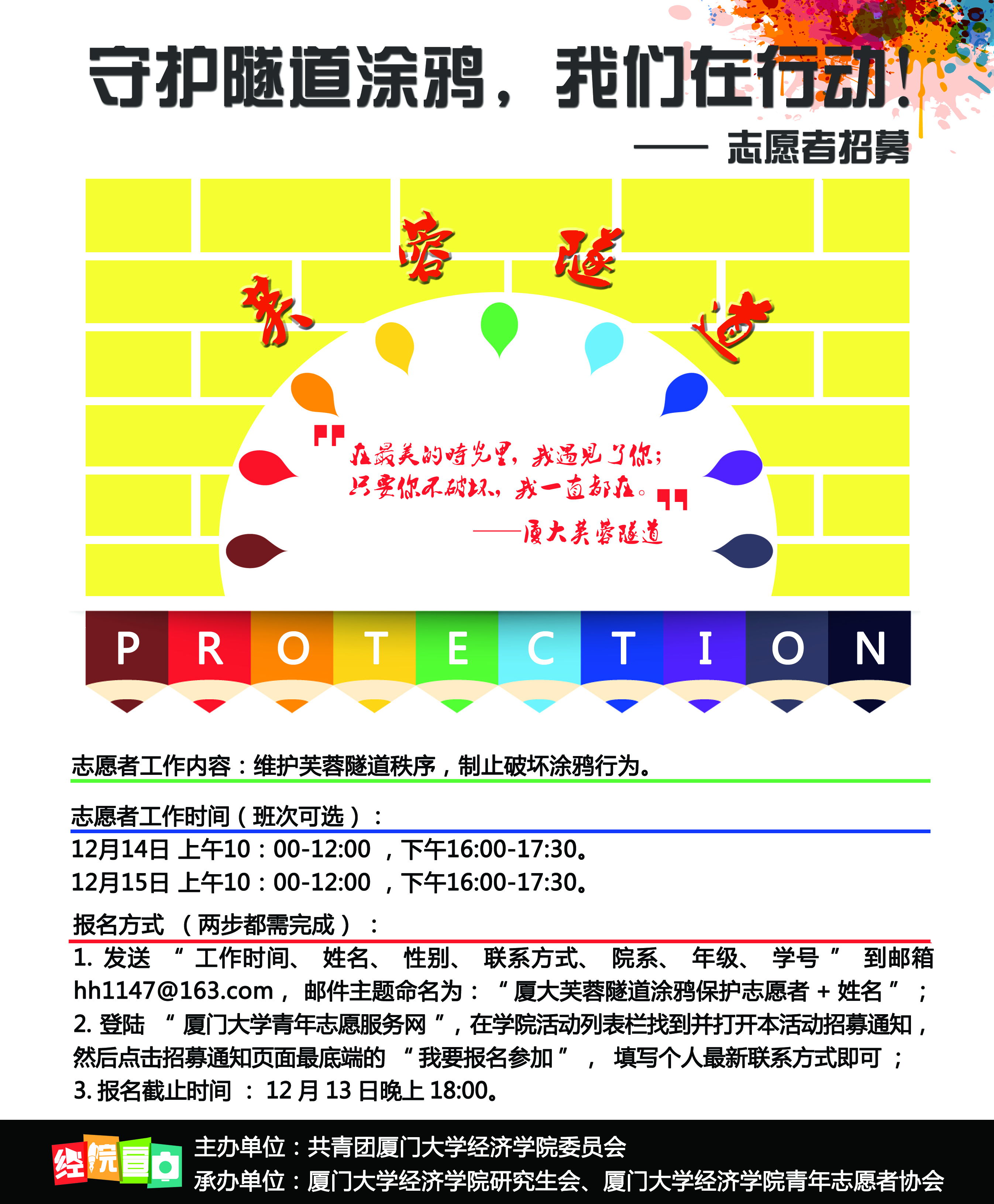 厦大芙蓉隧道位于厦大本部芙蓉餐厅旁,被称为中国最文艺的隧道,是厦门大学主要景点之一。由厦大学子一笔一划自发描绘而成的涂鸦构成了隧道内最美的风景,也吸引了无数游客来此观光,然而那些曾经干净整洁的涂鸦如今却“满目疮痍”,惨遭“到此一游”等破坏,很多游客在隧道里乱涂乱写。为了保护大家共同的隧道涂鸦,唤醒大家的文明意识,厦门大学经济学院研究生会拟在厦门大学公开招募一批青年学生志愿者,为“保护隧道涂鸦”提供志愿服务。招募青年志愿者的具体情况如下: