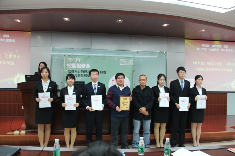 11月13日晚,由《南风窗》杂志社和厦门大学经济学院团委共同主办的“调研中国”大学生社会调查活动之厦门大学团队成果报告会在厦门大学经济学院N302报告厅隆重举行,福建省唯一一支获“调研中国”立项资助的团队,经济学院“台钱幕后”对其实践项目“陆资入台的现状研究、问题分析与前景展望”进行了成果汇报。《南风窗》杂志社主笔、畅销书作家石勇,《南风窗》杂志社研究部副总监陈可珺,厦门大学团委副书记葛郝锐,经济学院金融系教师蔡伟毅,能源经济研究中心教师孙传旺,经济学院团委书记马龙,团委副书记王婉琼、魏艳以及各系辅导员出席了报告会。
