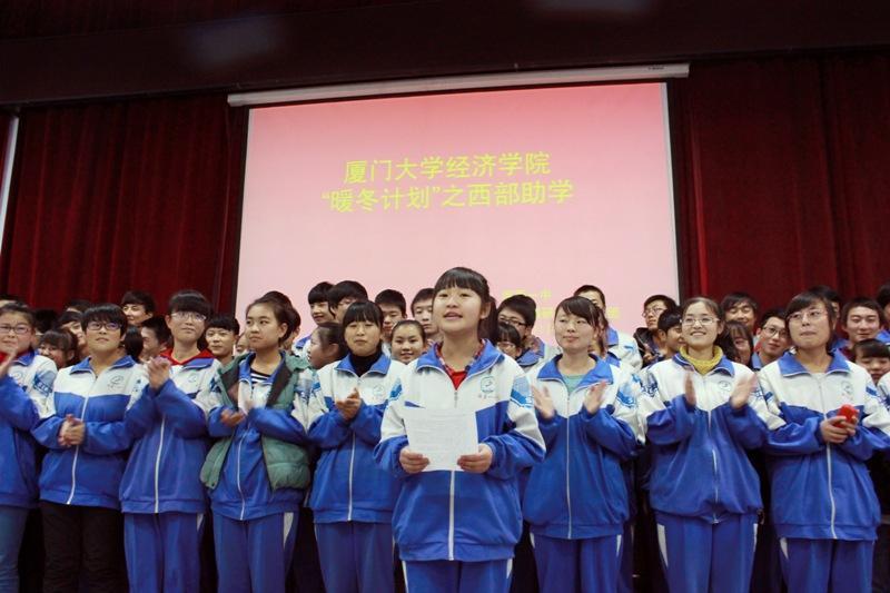 “我们特别感谢厦门大学经济学院的哥哥姐姐们心系边远的大西北,为我们这些贫困学子送来温暖。我们一定会好好学习,不辜负哥哥姐姐们的希望。”受资助学生代表马同学在宣读她亲手写的感谢信中这样说道。真挚的话语,坚定的眼神让在旁的支教队员们倍感欣慰和责任重大。“经过认真细致的考察,我们挑选出这60名最需要帮助的同学,并为每个学生分发400元,让他们买过冬衣物,在寒冷的冬季中能够温暖地在课堂上读书。”叶晓炜补充到。