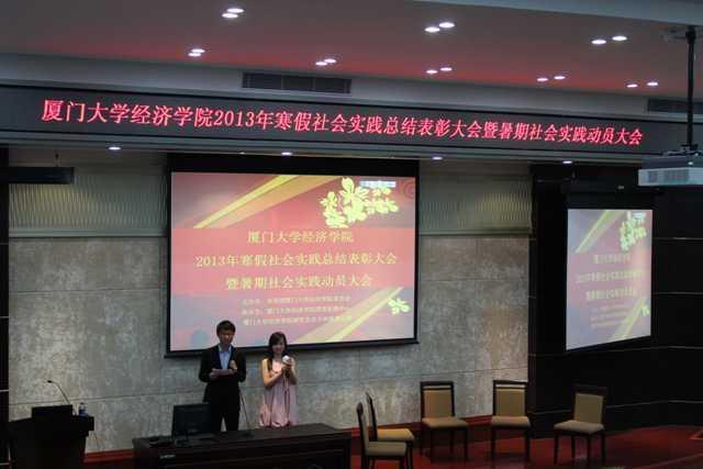 为深入学习宣传贯彻党的十八大精神,响应中共教育部党组《关于开展“我的中国梦”主题教育实践活动的通知》文件精神,2013年4月14日晚七时,我与我的中国梦——厦门大学经济学院2013年寒假社会实践总结表彰大会暨暑期社会实践动员大会在经济楼N402隆重举行。经济学院团委书记马龙老师,团委副书记王婉琼老师、魏艳老师,以及辅导员方晨亮老师出席了大会。