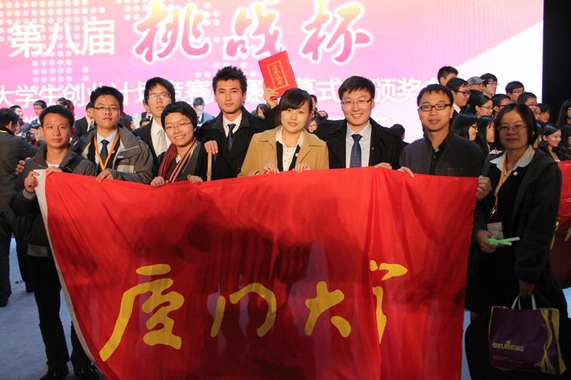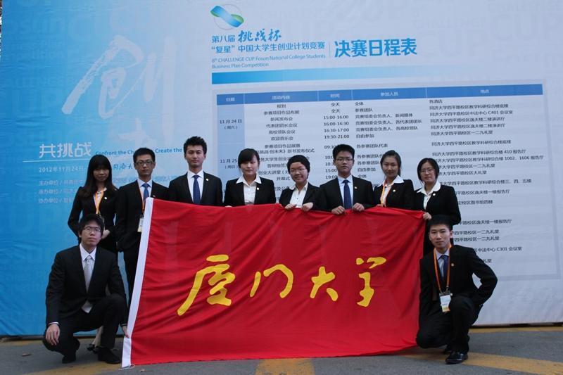 2012年11月28日晚,第八届“挑战杯”中国大学生创业计划竞赛决赛在上海同济大学落下帷幕,厦门大学共有三支创业团队参加此次竞赛,最终由我院2009级统计系本科生孙昊宇任队长,我院3名学子参与的博奥泰酶制剂有限责任公司β-葡聚糖酶项目获得金奖,银奖团队由管理学院本科生任队长,我院刘洋等4名学子参与的耐驰有限责任公司多功能汽车急救剂项目,铜奖团队由另一管理学院本科生任队长,我院陈格尔等4名学子参与的华轴传动有限责任公司AKN超级轴承项目。