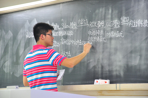 本次开班仪式邀请到的是2012级经济系博士朱昊,朱昊学长在攻读硕士期间曾担任学校数理经济学、宏观经济学、高级微观经济学助教,这也是他第三次站在“三高”辅导班的讲台上。仪式开始首先由研究生会主席张鑫为主讲教师颁发了优秀辅导老师的荣誉证书,随后就进入主题。朱昊学长本次演讲主要分为两部分,首先讲授了“三高”的学习方法,从为什么学习“三高”、学习“三高”的基本方法、相关刊物推荐三方面入手,讲解了在“三高”学习的过程中应该注重从工具和思想两个方面提高自己。学习中要夯实数学基础、掌握相关分析工具在此基础上培养自身的实证分析能力,为今后的学习研究做好基础准备。此外,他还强调通过大量阅读经济学著作和文献,进行独立思考来提高思辨能力,这也是我们研一新生在学习“三高”乃至进一步进行深造所必须做到的。在第二部分中,朱昊学长主要介绍了高级宏观经济学的整体框架,对本门课程中所要涉及的主要模型进行了简单的串联介绍,并根据研一新生的课程进度对课堂内容进行了拓展和延伸。老师的讲解深入浅出,同学们也以满满的学习热情认真听讲做笔记。本次讲座最终取得了圆满成功。