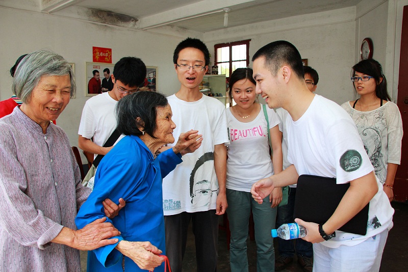 厦门大学金融系“绿动龙缘”实践队的学生党员元彬龙与老奶奶亲切交谈,之后实践队队长林永兴向老奶奶赠送了由实践队队员准备的具有厦门大学特色的纪念品。老奶奶勉励实践队的同学们要努力学习,争取学到更多的知识好为国家多做的贡献。老人还祝实践队的队员们家庭和生活都团团圆圆、幸福美满、节节高升。实践队临时党支部的成员、预备党员宁博同学向老人了解光荣的革命历史,并表示了“永远跟党走”的坚定信念。最后实践队员与老人握手告别,老奶奶再三嘱咐同学们奋发上进,欢迎大家再来福建上杭古田。